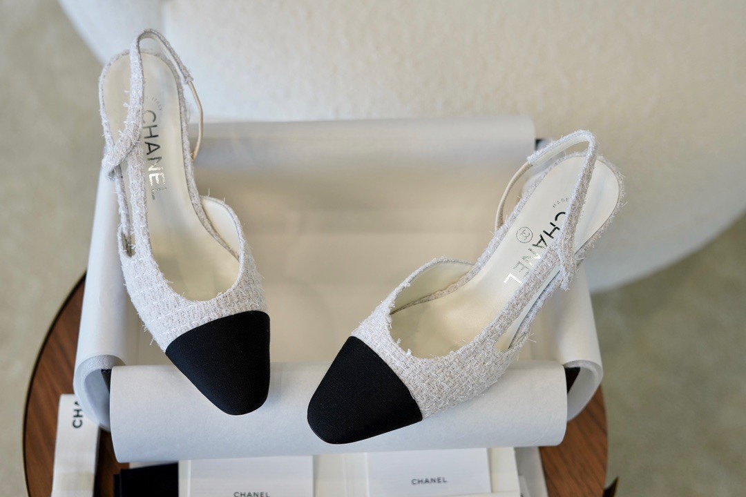아이스 화이트 트위드 슬링백 굽의 순동 진공도금 로고, 독자적인 프라이빗 모델 개발 국내 수입 최고급 심택스 공장 트위드 모직으로 짜임이 균일합니다. 세련된 이너컷팅입니다 발받침 독자기술로 스크래치에 강한 열자 입니다. 우리집 금자간판, 슬링백골입니다. 이태리 수입 가죽 바탕에 깊이가 균일한 로고 레터링입니다.