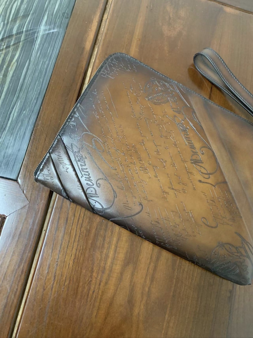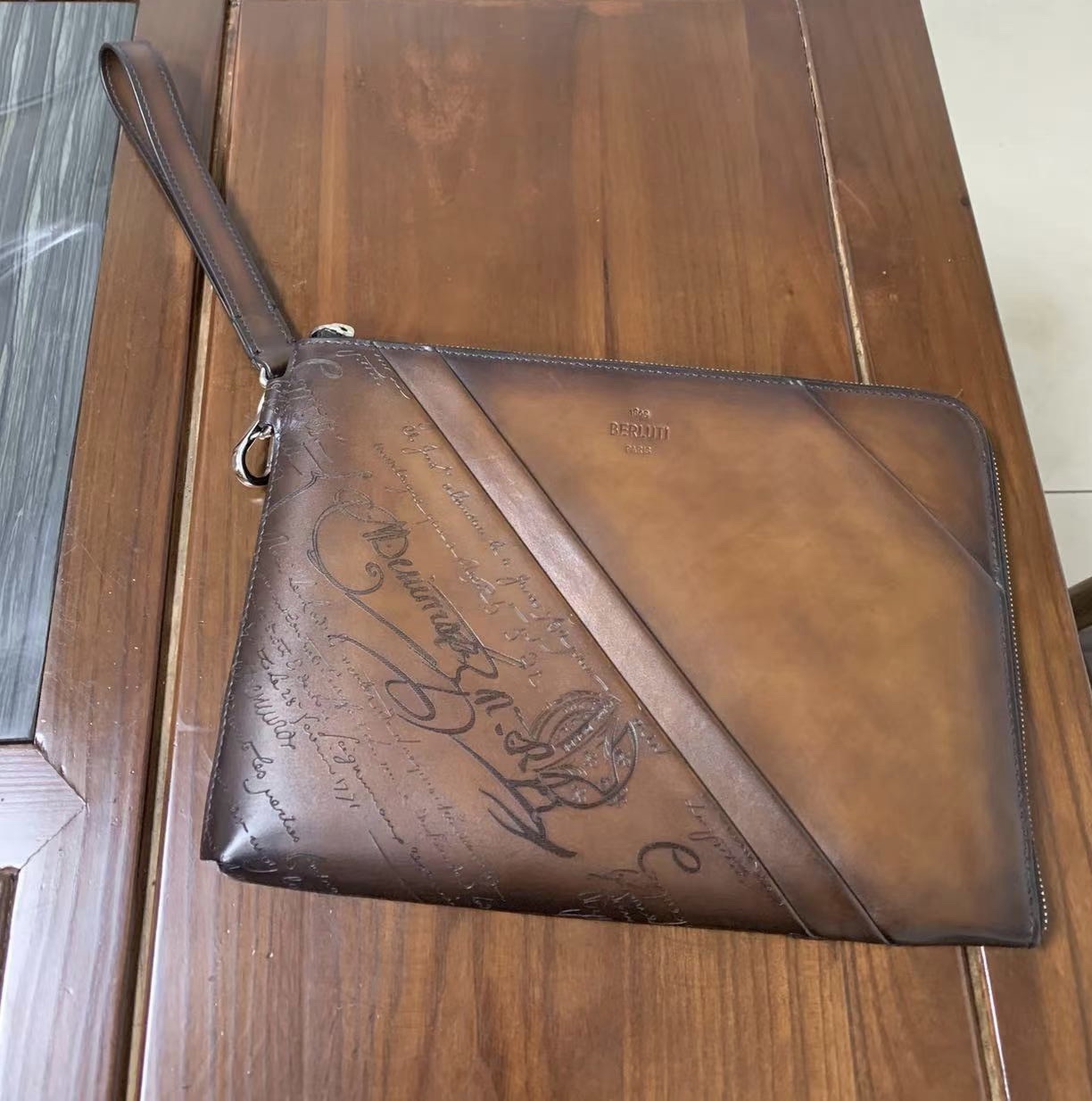 BERLUTI Nino GM Scritto 패턴 가죽 클러치백 클래식한 베네치아 가죽, Scritto 조각, 면/린넨 안감, 순수 천연 고법의 핸드메이드 색칠 공예 외부 특징: 데코 D링, 라지 지퍼 클로징, 유니크한 디자인 내부 특징: 평평한 포켓 2개, 그 중 하나에 6개의 카드 슬롯 생산: JOUR 사이즈:29.5cm x 21cm