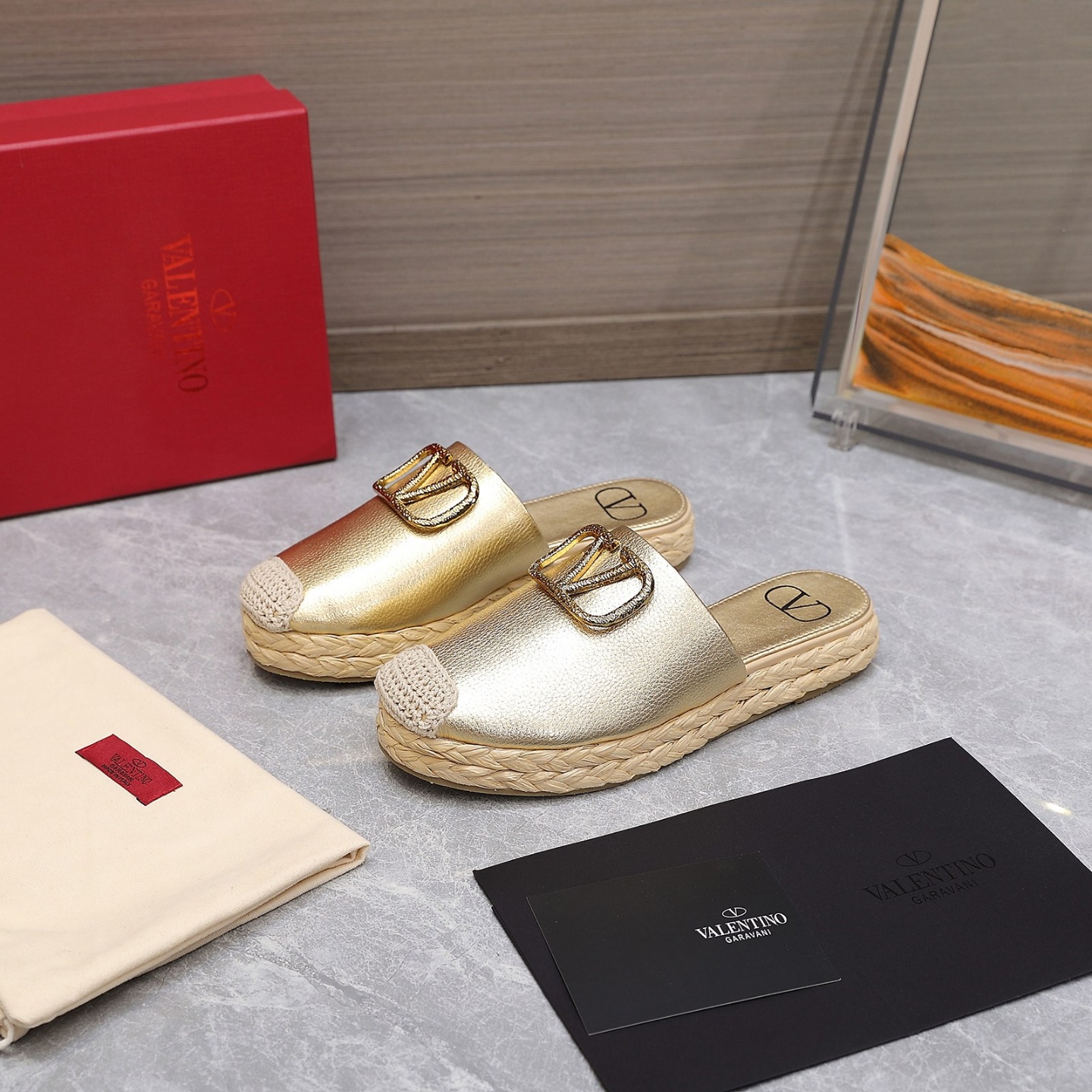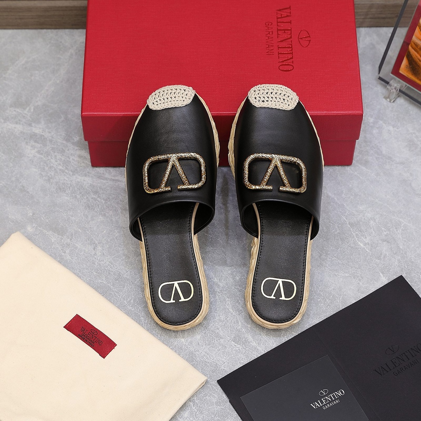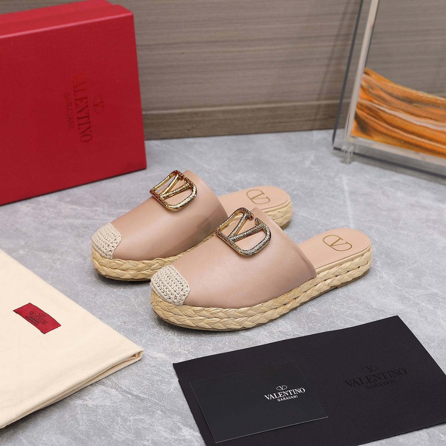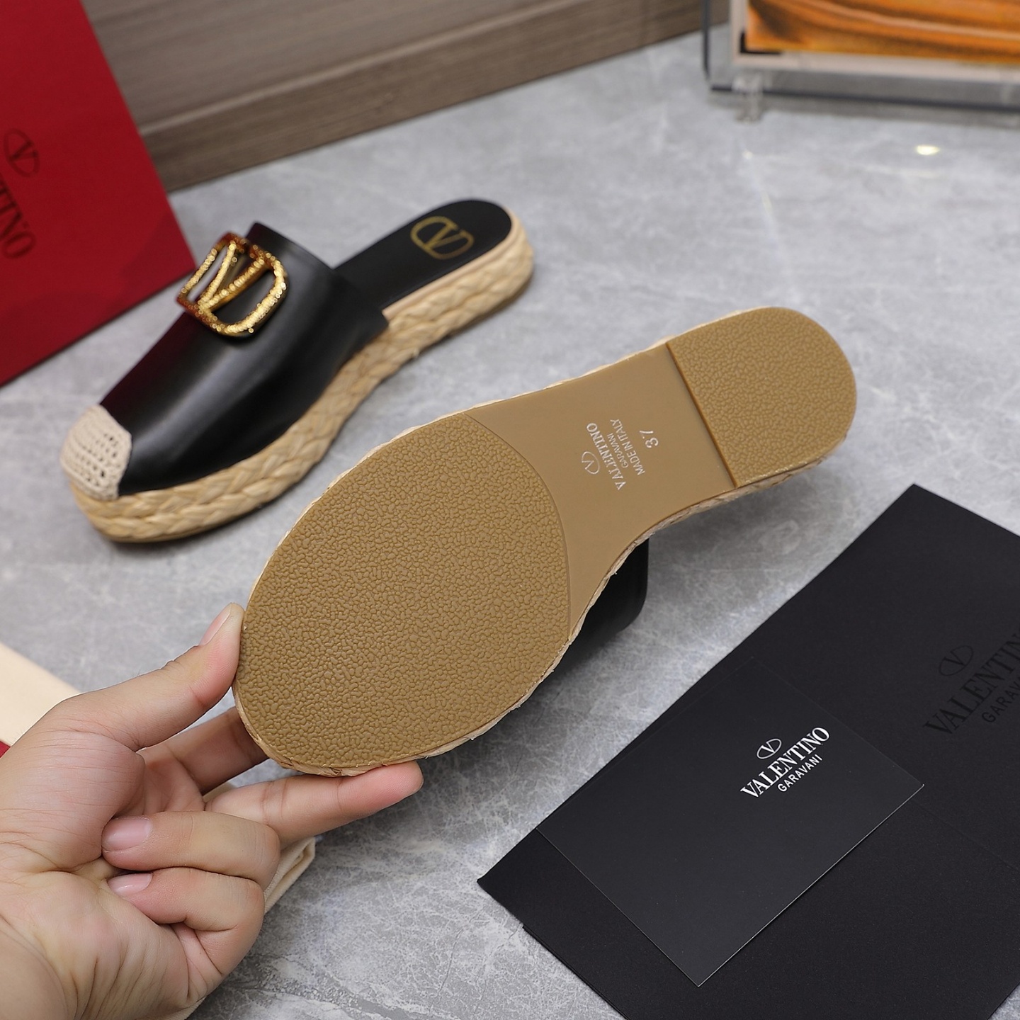 발렌티노 에스파듀 삼끈 바닥 슬리퍼 2022 최신 메탈 로고 밍크 통굽 슬리퍼 플랫 오리지널 구매 1:1 프리미엄 복각 신발 겉면 : 오리지널 수입 소가죽 속: 오리지널 수입 양가죽 대저 : 수입 생고무 높이 2cm