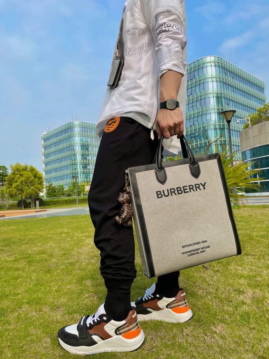 【B가의 최고급 오리지널】 오픈형 토트백으로 면 캔버스와 디밍 라인 가죽으로 제작 Horseferry 배지 프린트가 돋보입니다 손으로 들거나 탈부착식 어깨끈으로 휴대 가능 사이즈 : 35.5 x 8.5 x 38cm