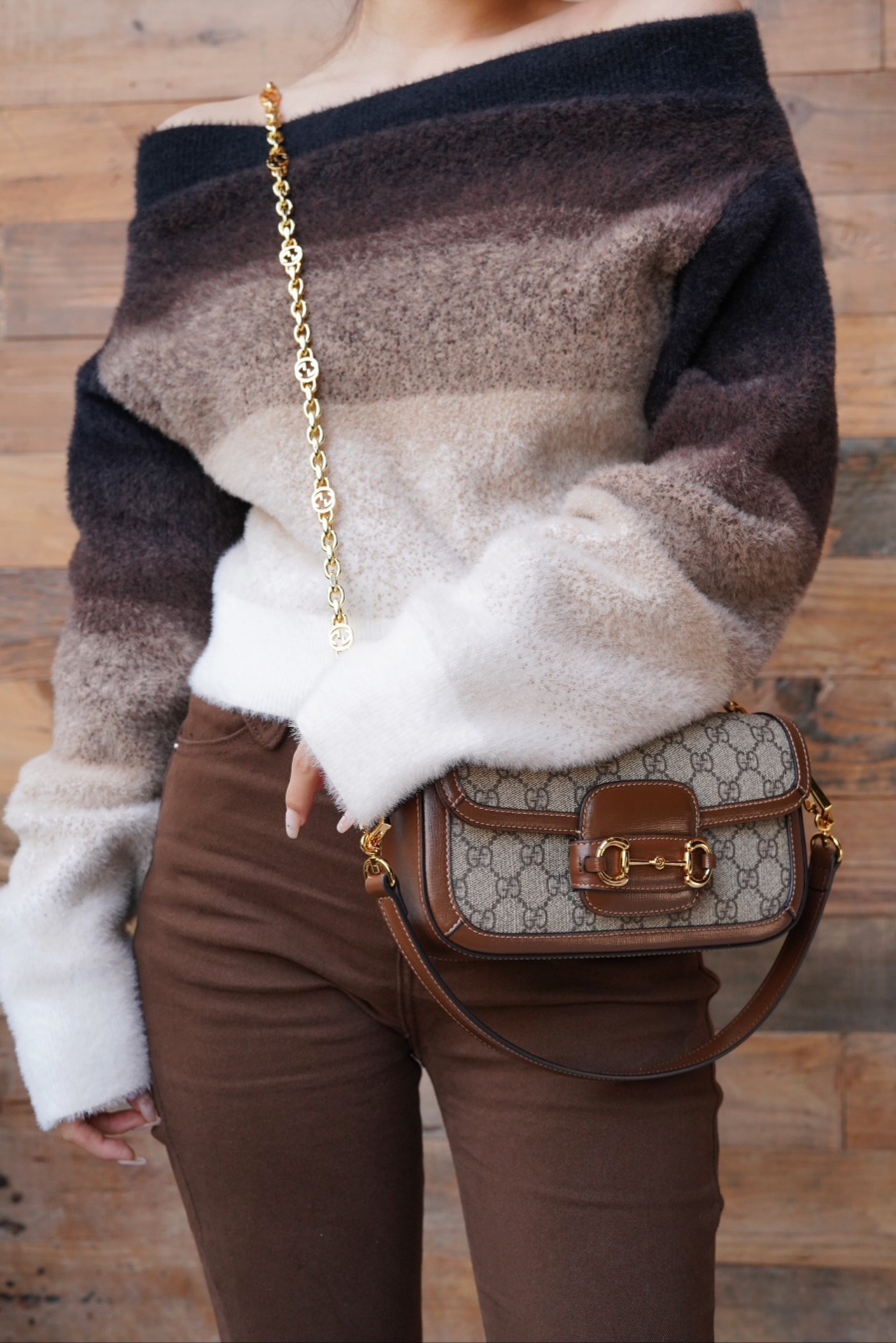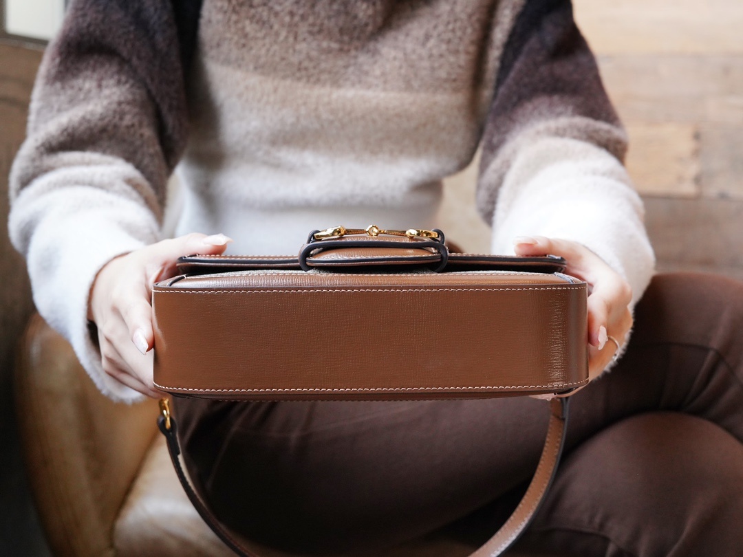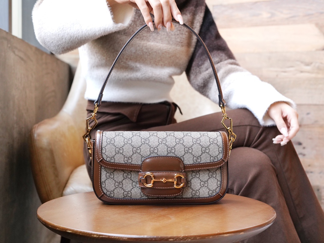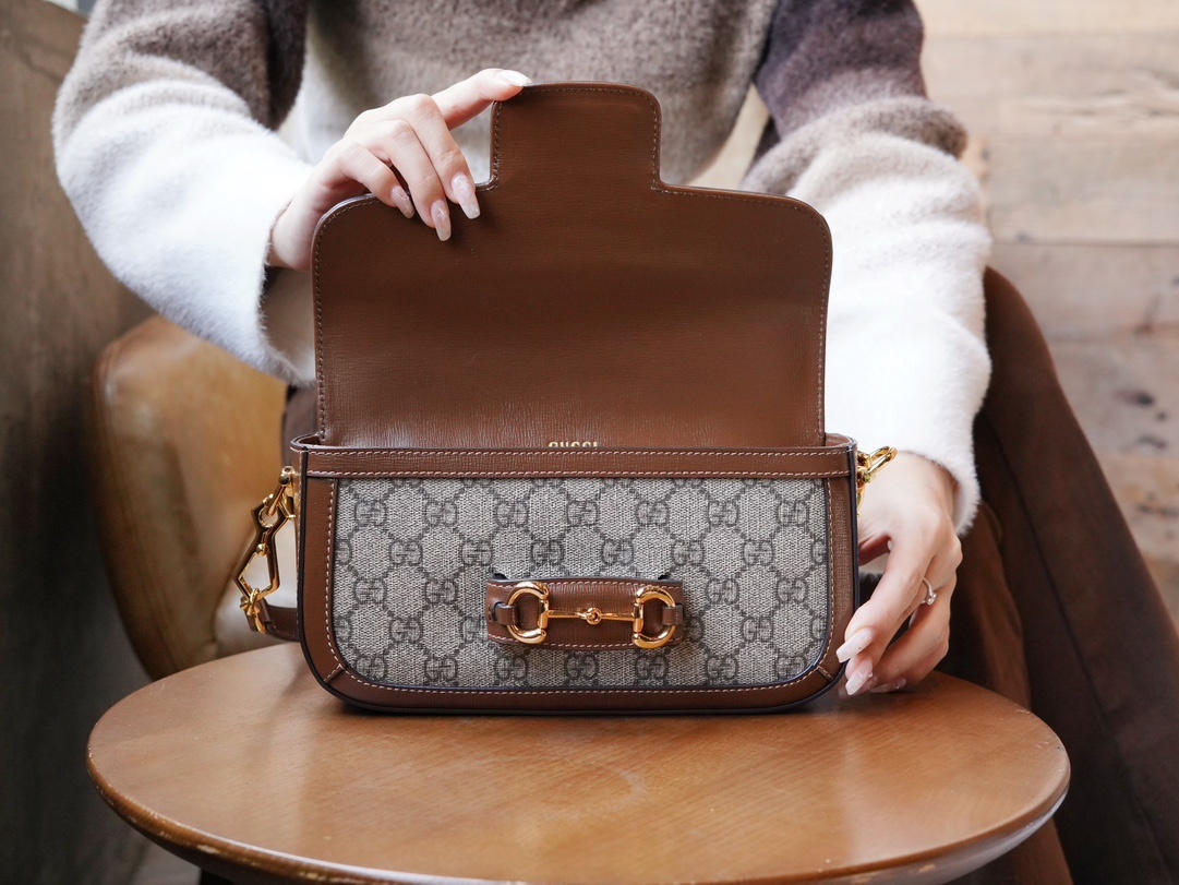 Horsebit 1955 컬렉션 패턴은 브랜드 승마에서 영감을 받았으며 이중 링과 긴 막대 모양의 두 가지 요소로 구성되어 있으며 오늘날까지 브랜드의 매우 식별 가능한 상징적인 요소 중 하나 사이즈 : 24*13*5.5cm 모델번호:735178