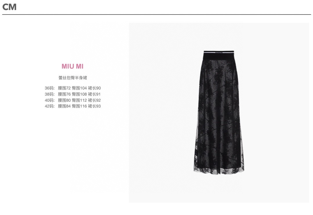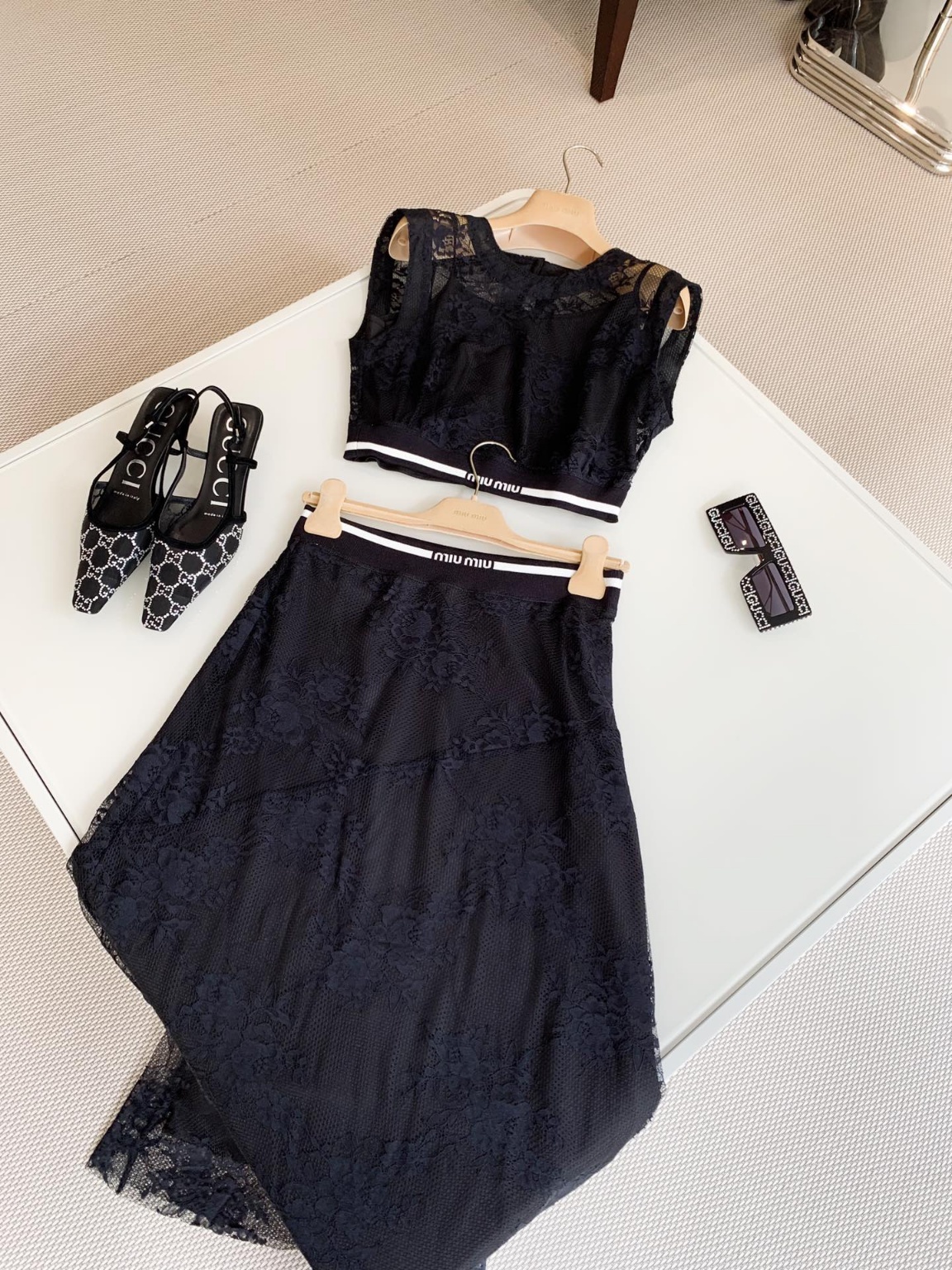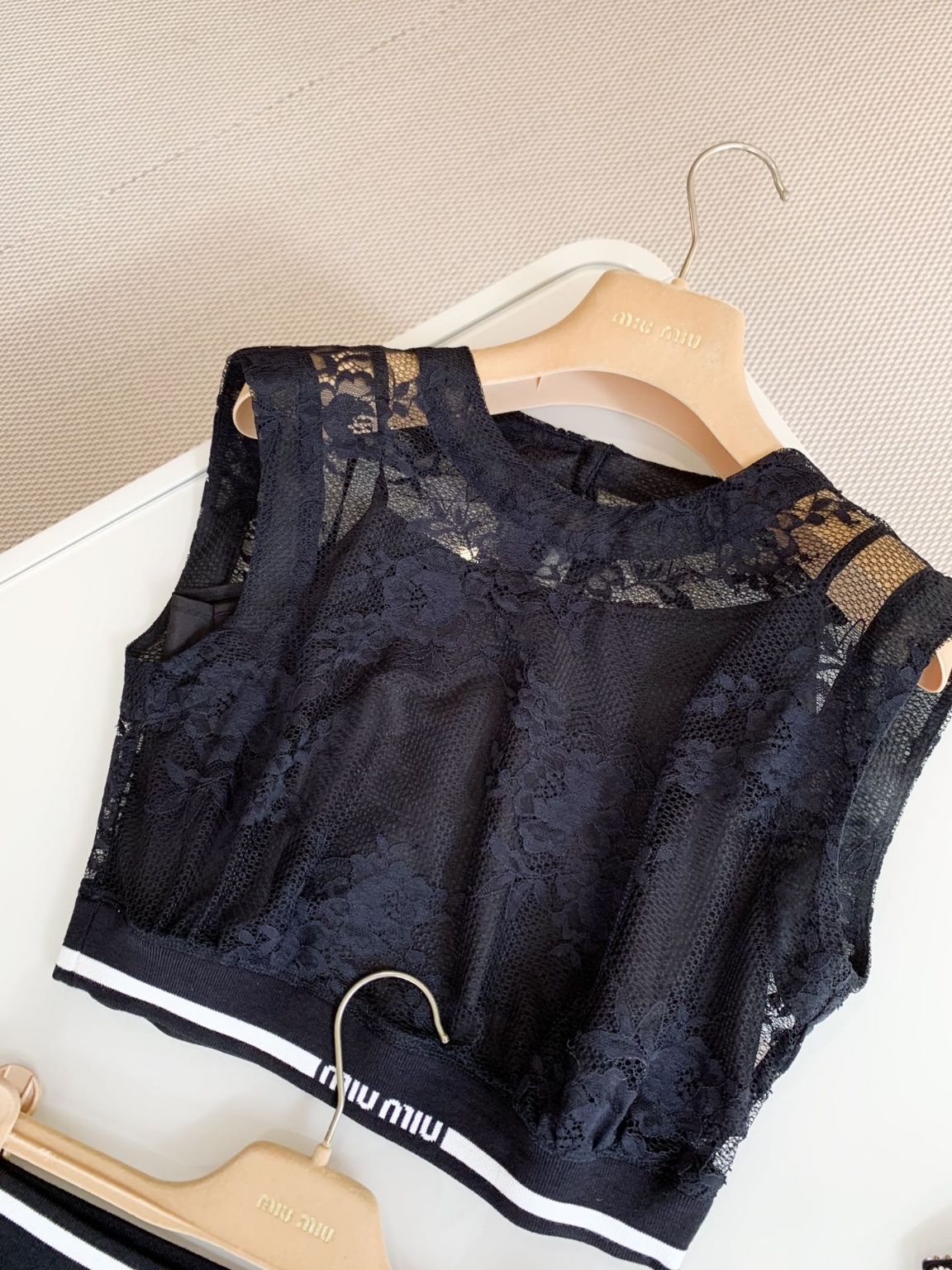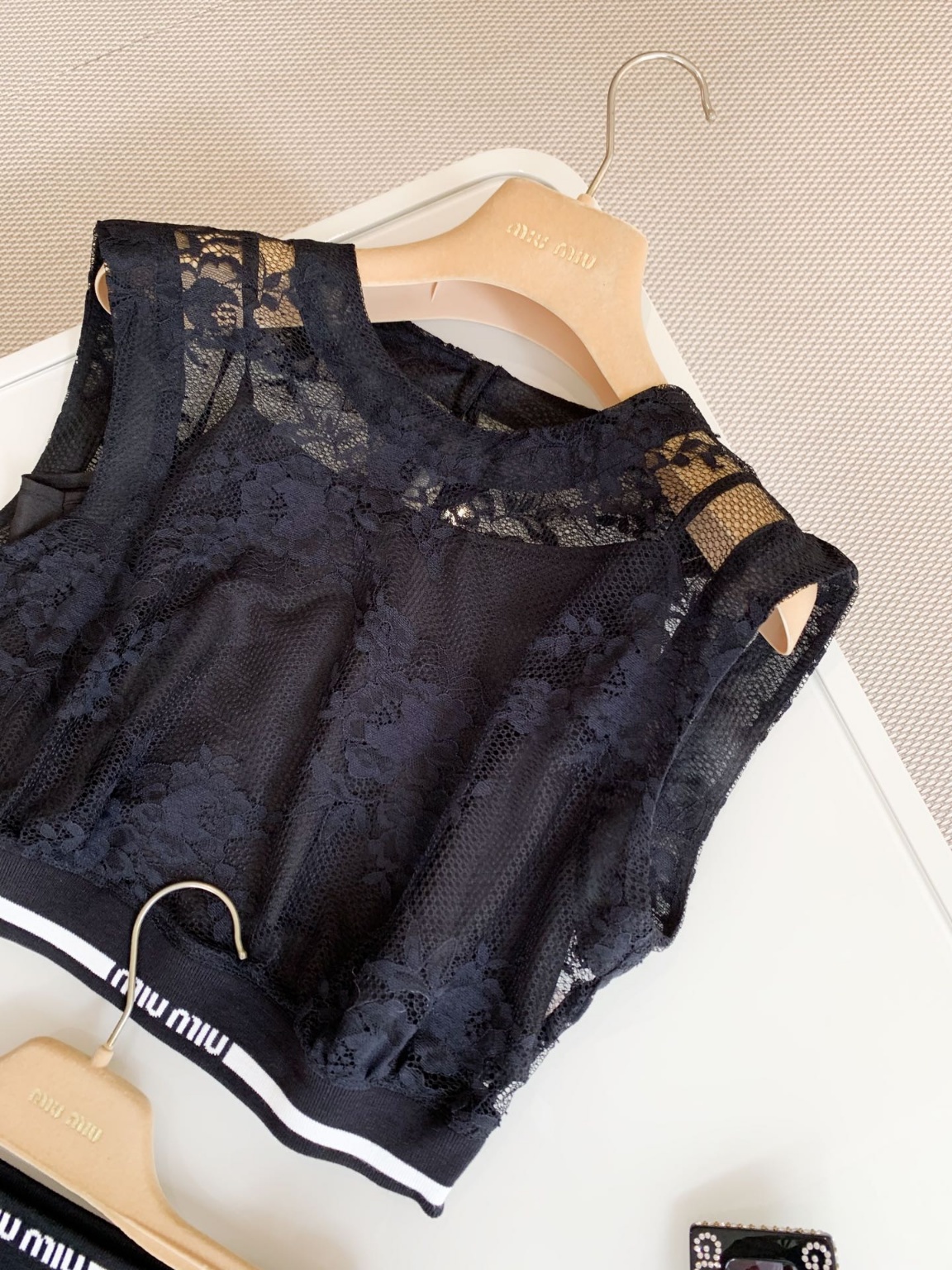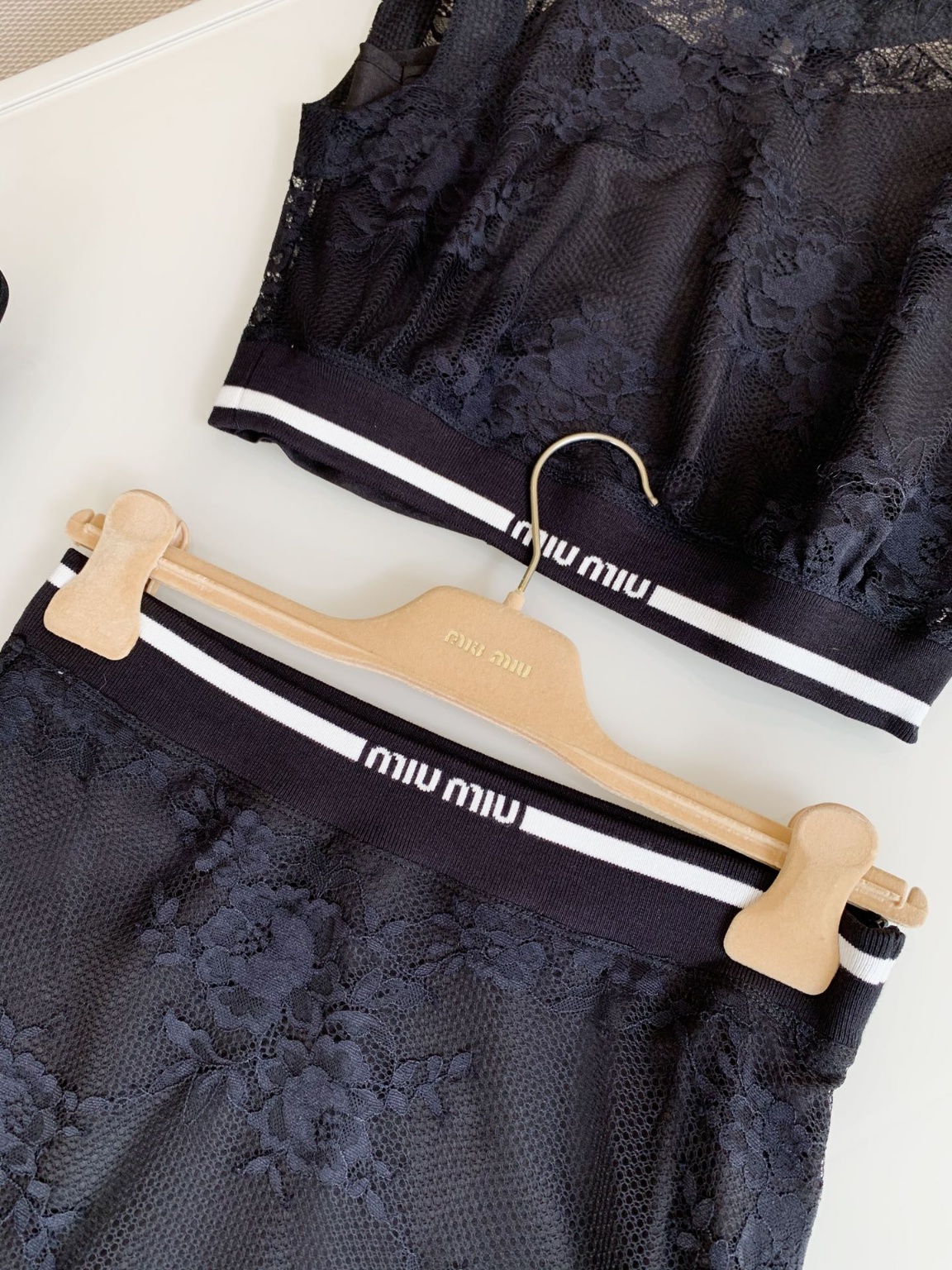 MIUMI* 23 봄여름 레이스 미니 세트 스포티한 요소와 장인의 전통이 어우러진 로맨틱한 레이스 숏컷 핏의 초산나시 안감 있는 스커트 내추럴한 슬립 밑단 블랙 니트 미우 레터링으로 최고판 발매