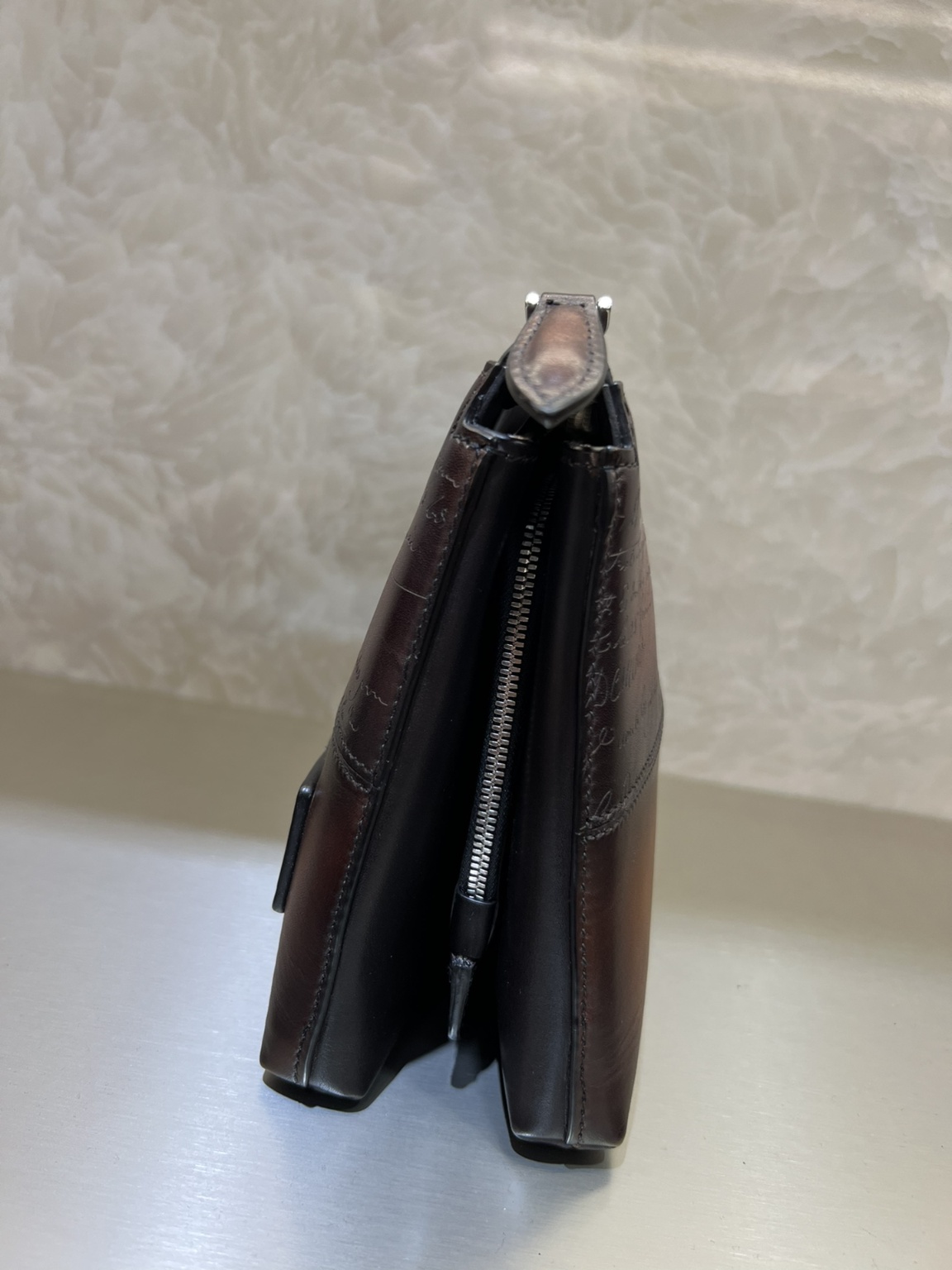 BERLUTI⚡ TERSIO Scritto 패턴 가죽 클러치백 한 면에 4개의 서로 다른 베네치아 가죽 3가지의 옅은 파티나 컬러와 한 변의 조합 외부 특징: 원 지퍼 클로징, 베네치아 가죽 손잡이 내부 특징 : 플랫포켓, 플랫포켓이 있는 칸막이 신용카드 슬롯이 6개 있는 칸막이, 빅사이즈 지퍼포켓 사이즈 : 높이 16.5cm - 폭 25cm - 두께 5cm