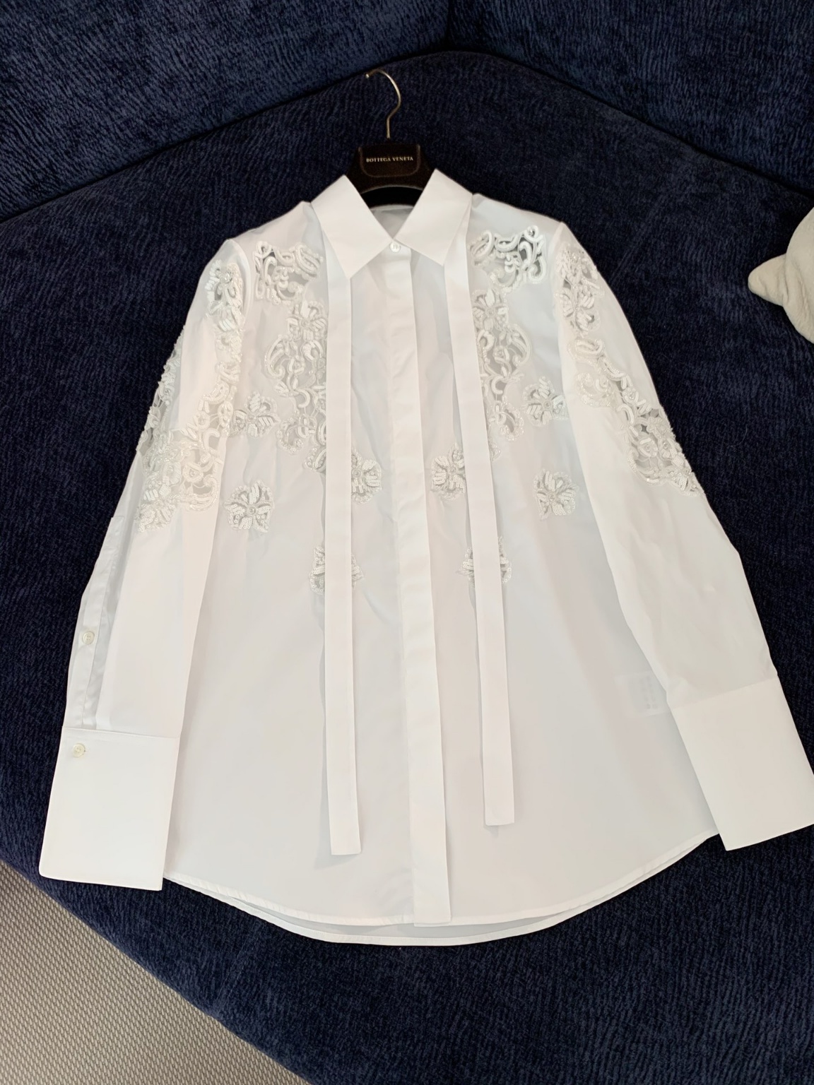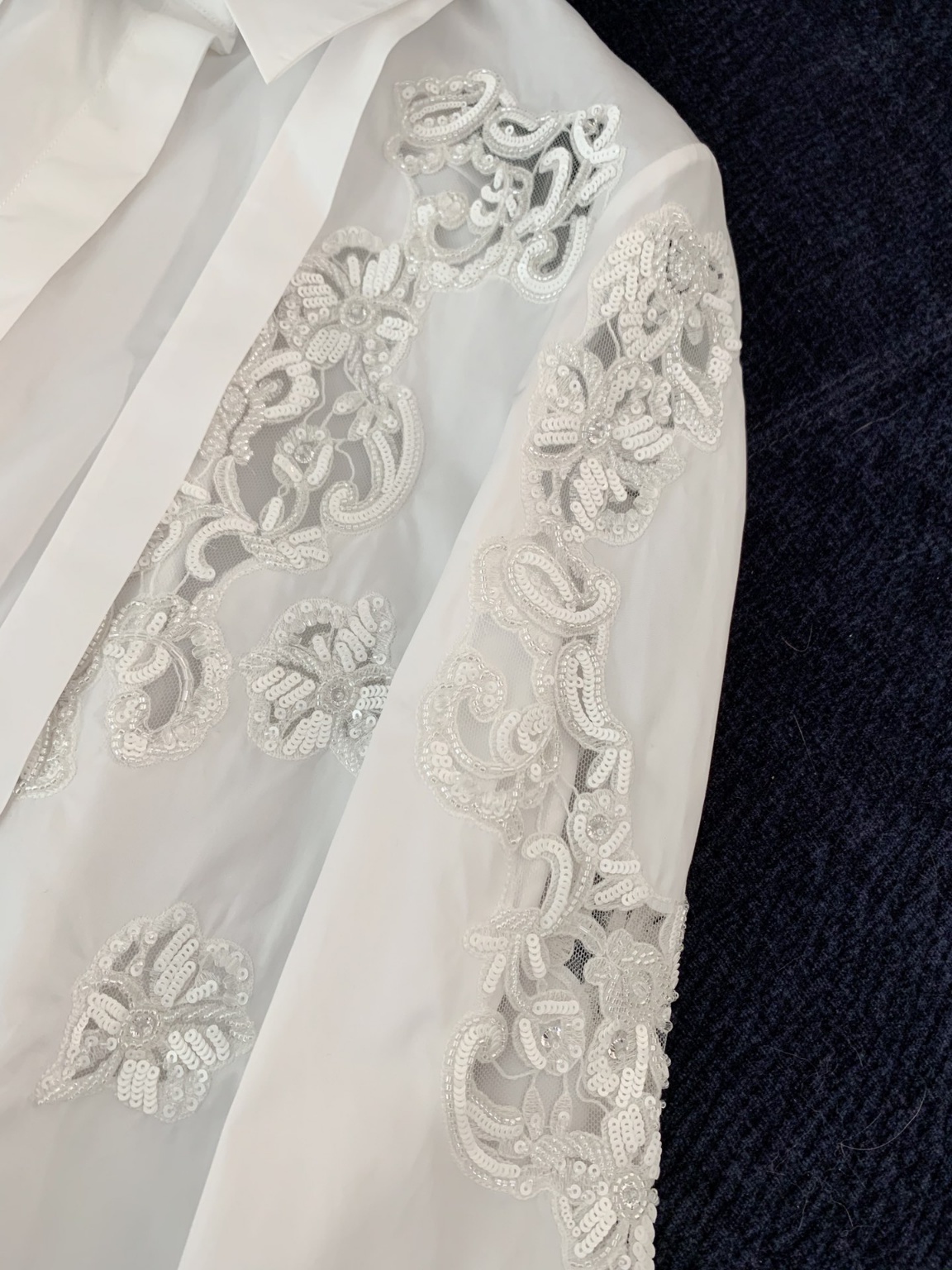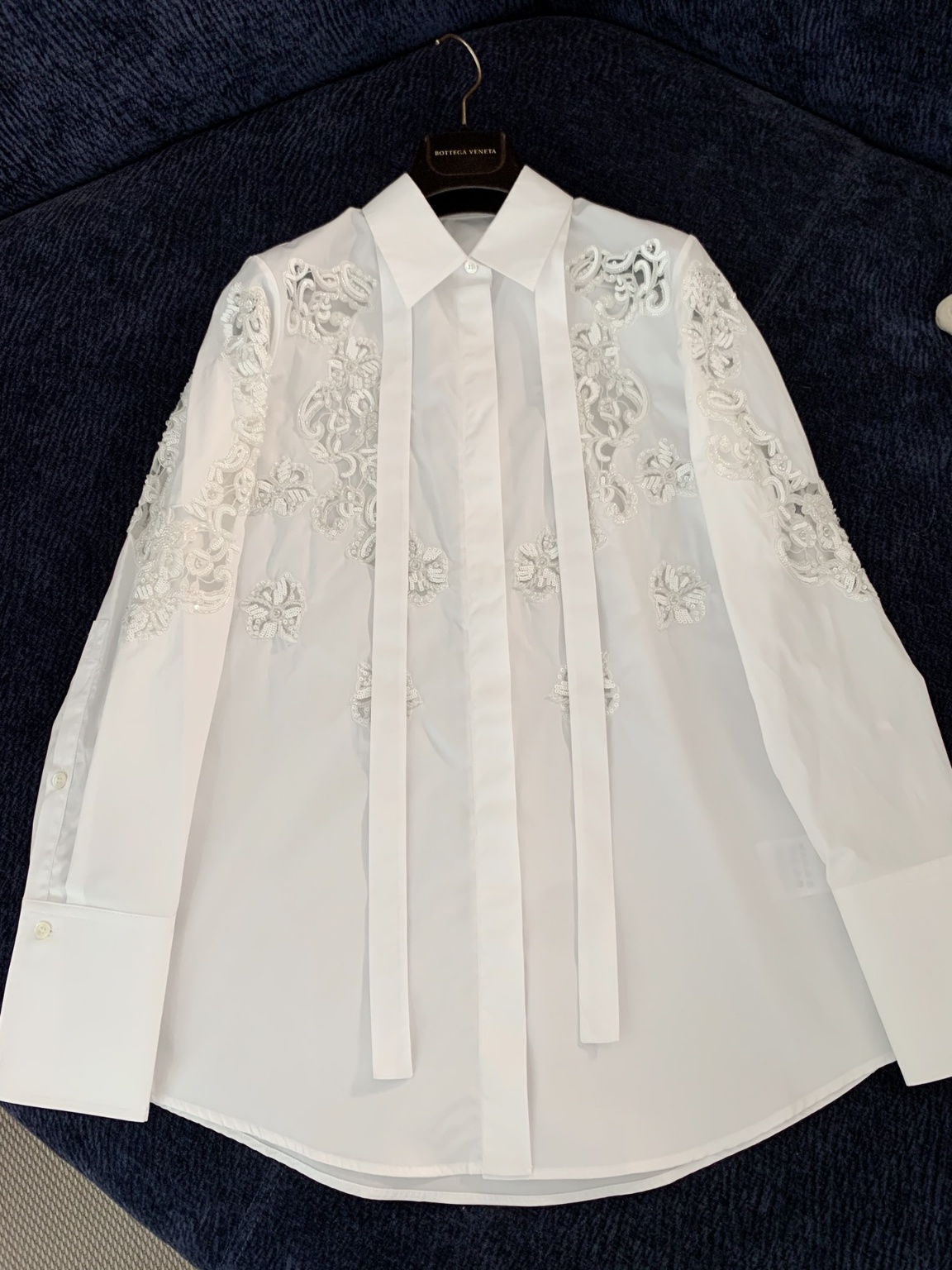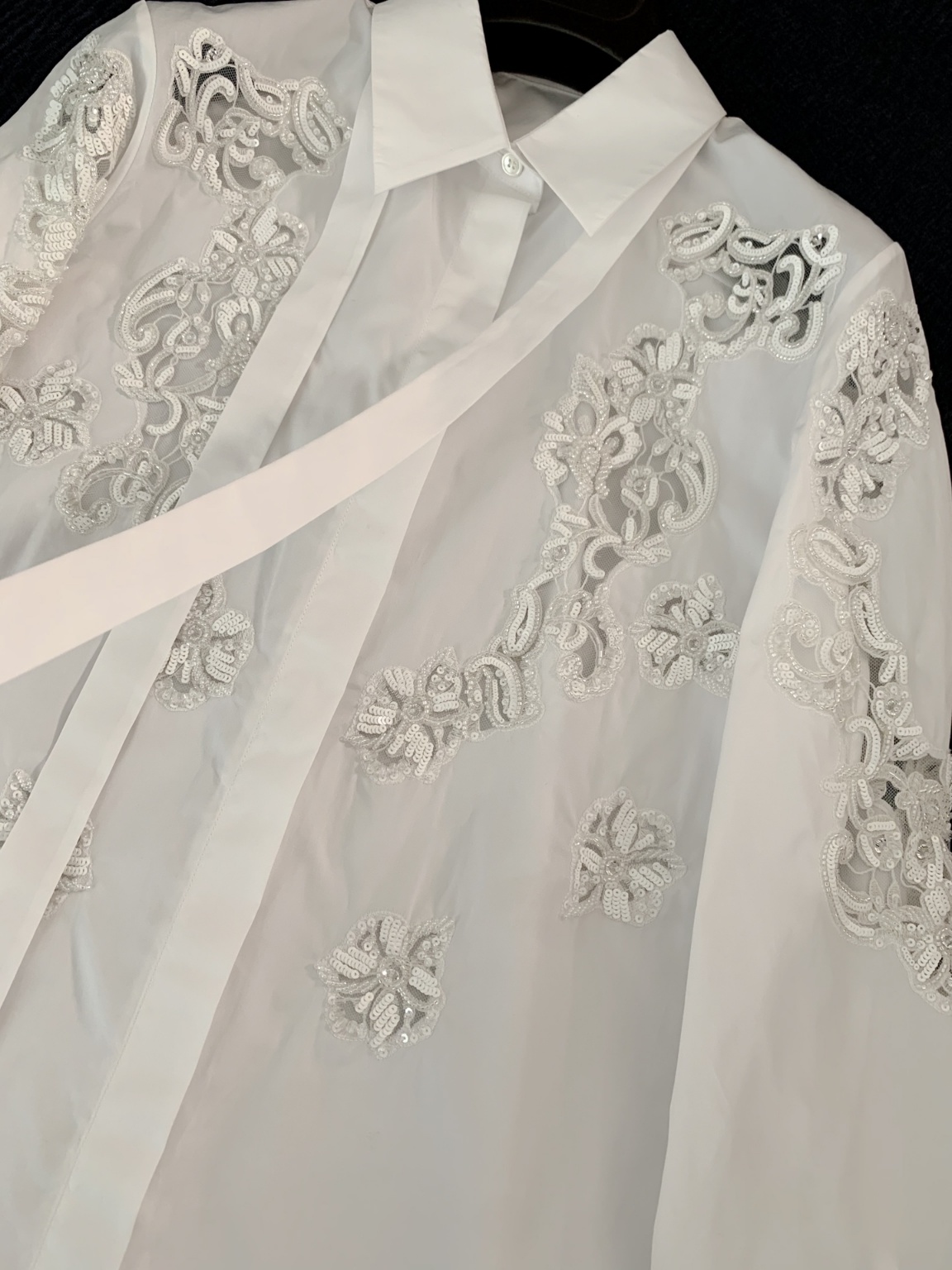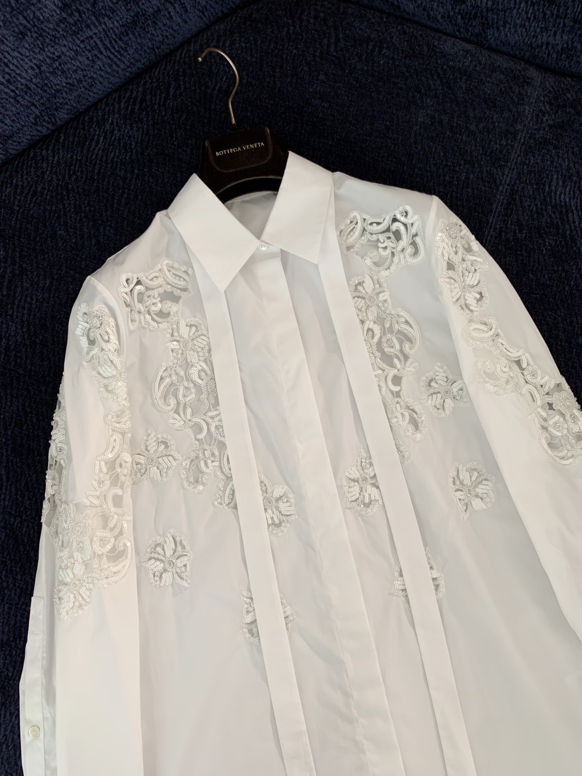 VALENTIN* 23 봄여름 징구슬 자수 화이트 셔츠 정직 포플린 코튼 원단이 힘있게 완성 수작업으로 구슬을 박아 아름다운 얼굴을 연출할 수 있는 아이템 네크라인 스트랩으로 프렌치한 로맨틱함 단품으로 입어도 이너로 매치해도 예쁘고 최고 핏