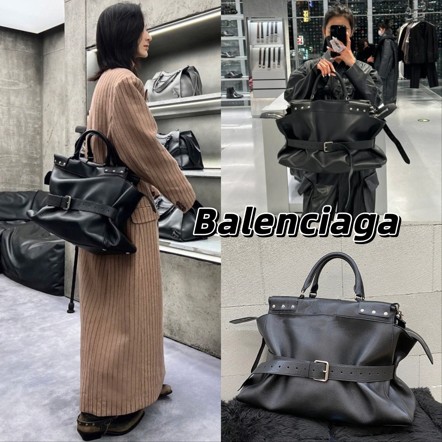 Balenciag* 웨이스트 라지 핸드백 가방 가운데 가죽 스트랩을 묶어 클래식한 바스크 스트랩에서 영감을 얻었으며 하라주쿠 스타일의 버클 아이 스트랩을 주 포인트 리치한 가죽 패턴으로 보디를 만들어주며 시크한 블랙 배색으로 빈티지 펑크 분위기 사이즈 : 밑단길이50x폭17x높이37cm