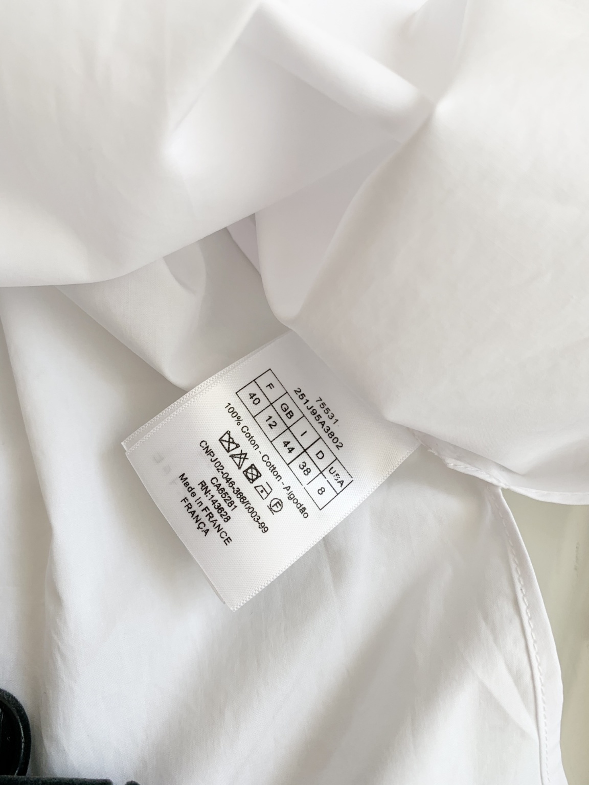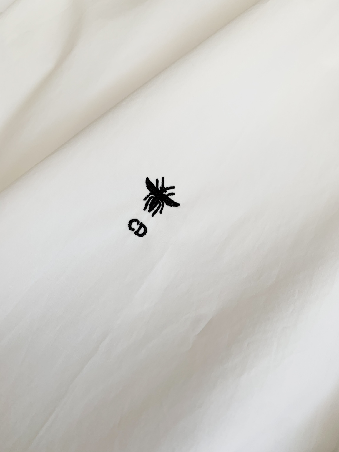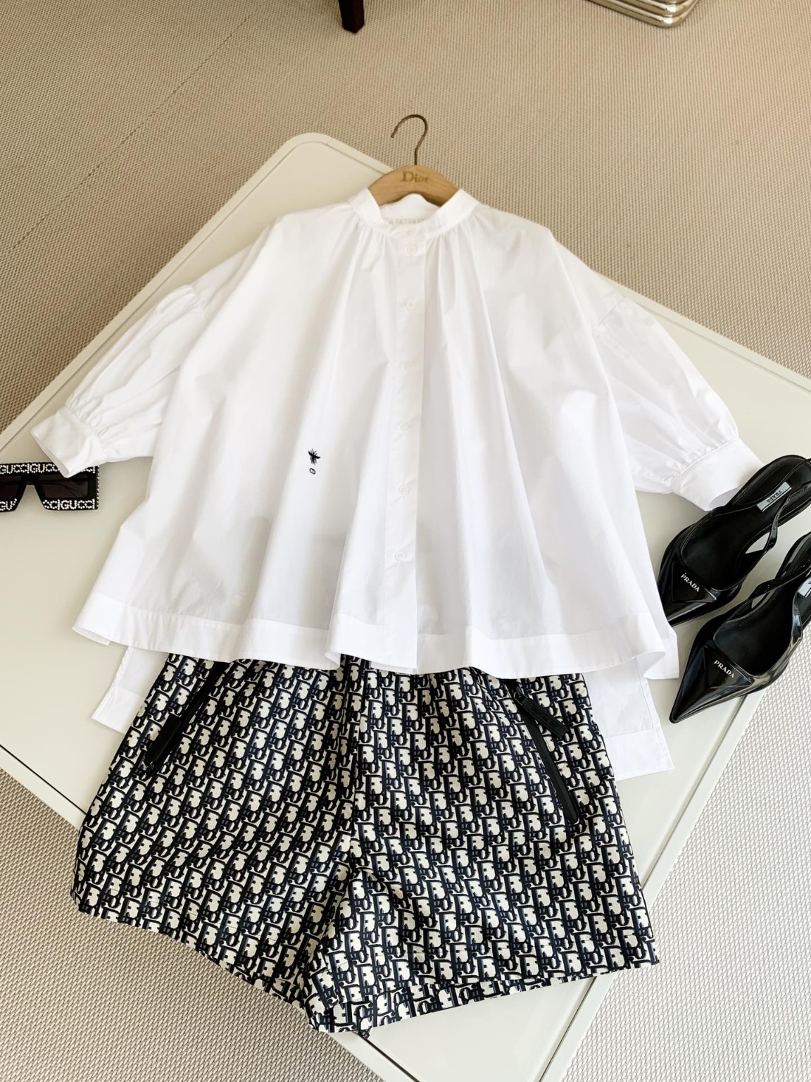 DIO* 23 봄여름 벌룬소매 라운드 화이트 셔츠 앞이 짧고 뒷이 긴 실루엣 커팅 화이트 코튼 포플린 원단으로 정성스럽게 제작된 루즈핏 커팅 차이나넥 플리츠와 7부 퍼프 소매로 포인트 CD 꿀벌 자수로 세련되게 연출하였으며 최고 버전 발매