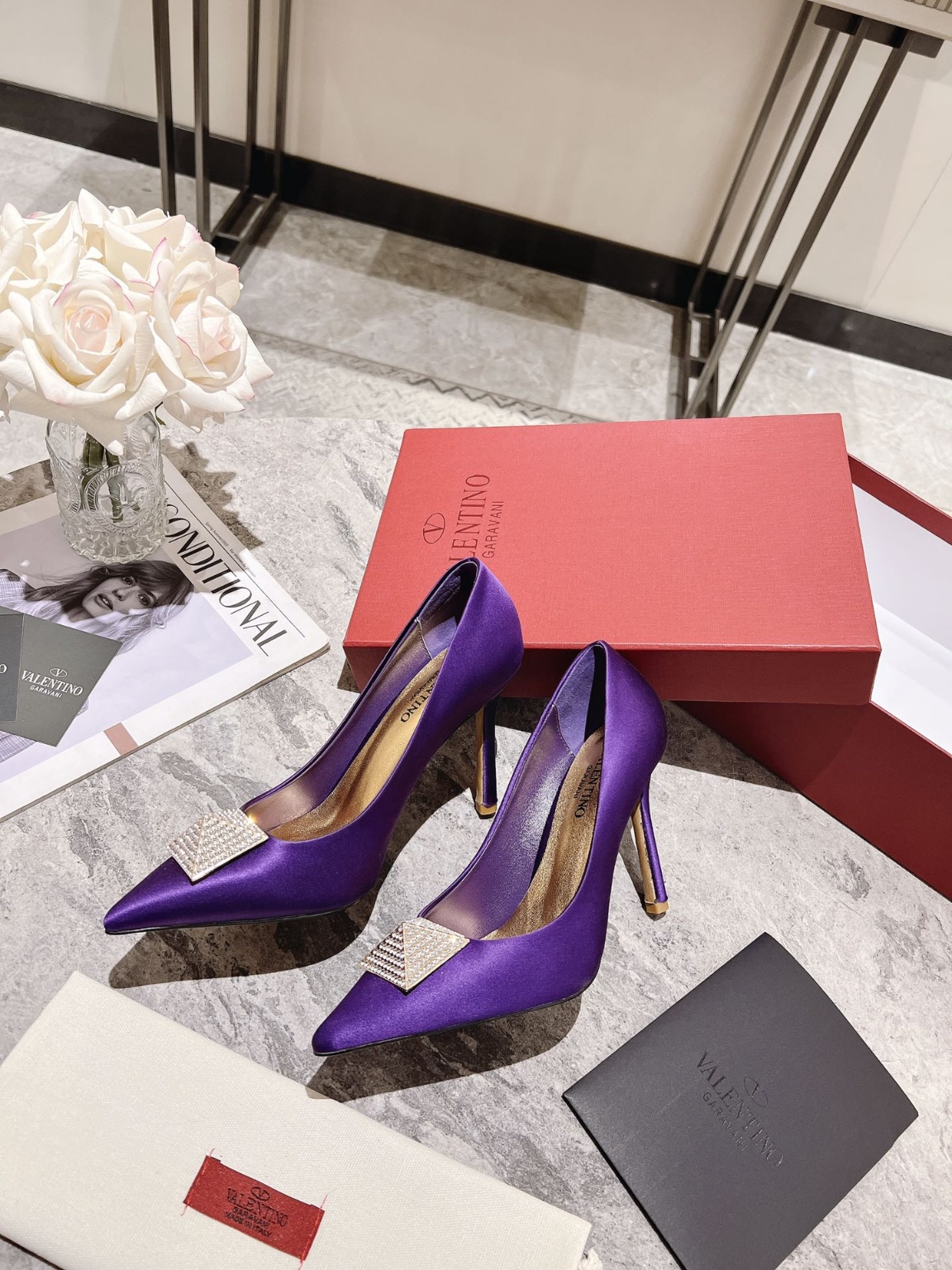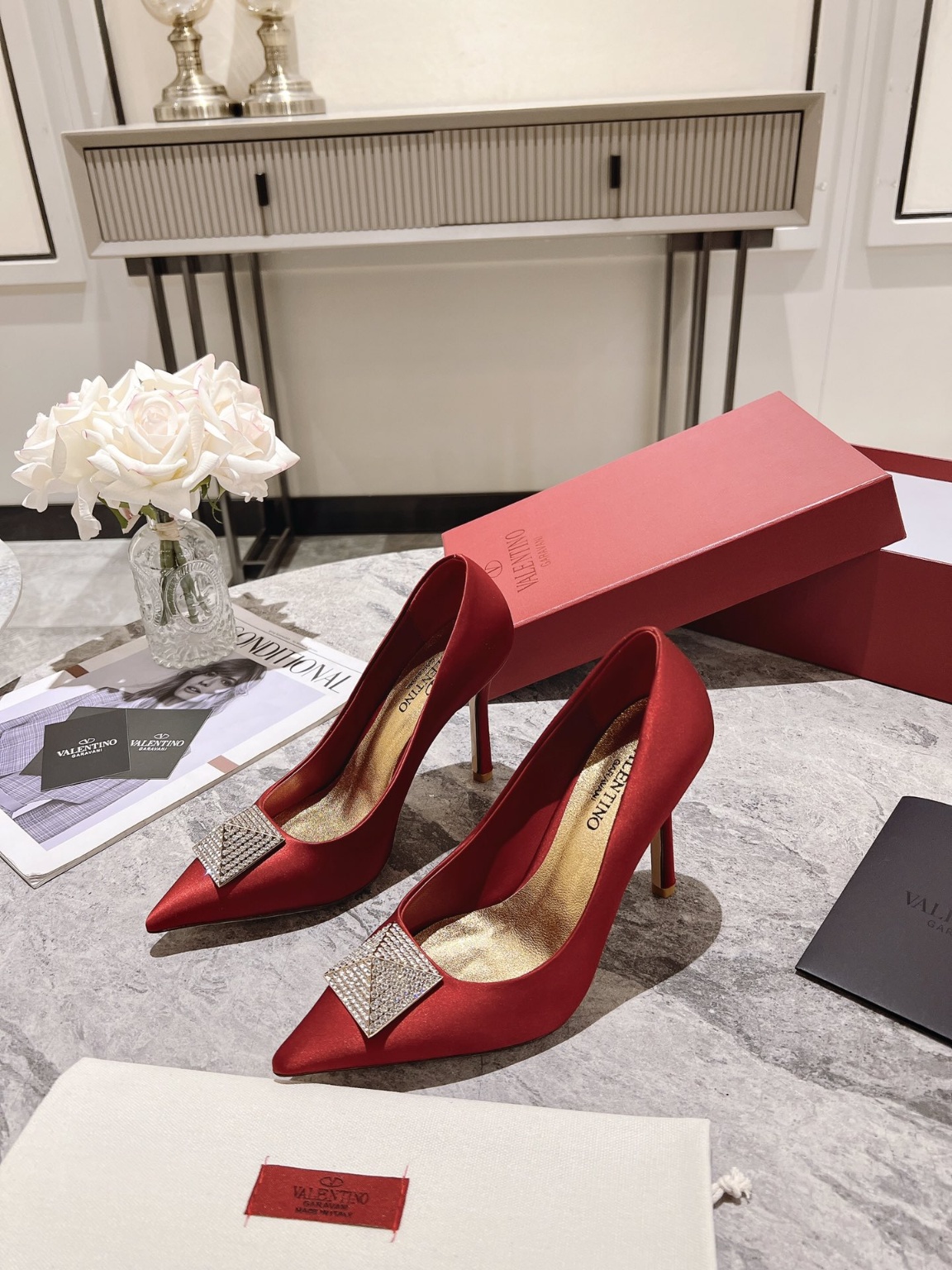 발렌티노 2023 봄여름 신상 여성 하이힐 유니크한 【피라미드】빅 스터드 메탈 【수제 큐빅】 수입 실크 절대 프리미엄 오리지널 포뮬러 절대 감성 겉감: 수입 하이라이터 실크 원단 속:속 양가죽 굽:10cm