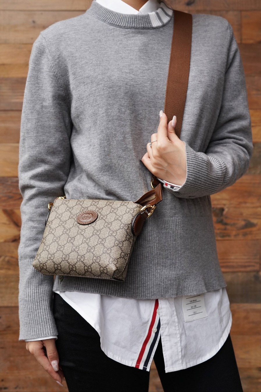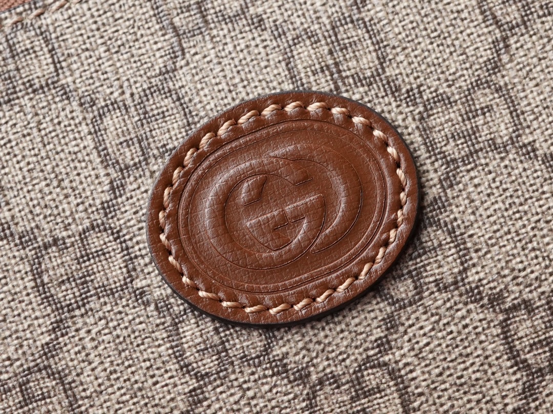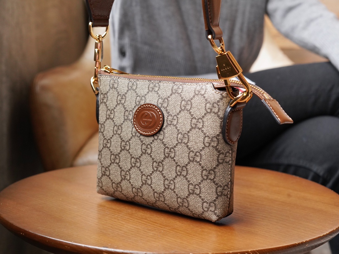 인터로킹 더블G 메신저백 브랜드의 상징과 가죽 디테일의 조화가 돋보이는 메신저백 베이지와 에메랄드 컬러의 모노그램 캔버스 소재 사이즈 : 16*13.5*3.5cm 모델번호: 723306