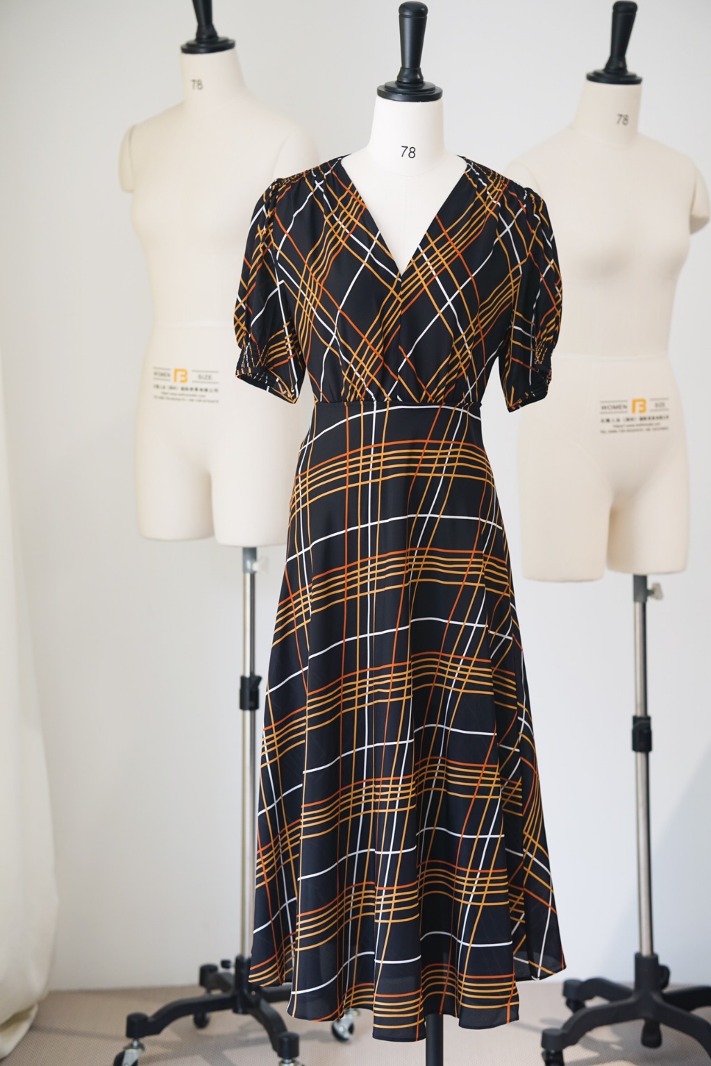 MARN* 23 봄여름 체크 실크 원피스 정직 YB 누에 실크 원단 스탠딩 디자인 브이넥 퍼프 소매 포인트 슬림하고 날렵해 보여요 프렌치 빈티지한 느낌으로 단품으로 입거나 아우터에 매치 스타일링 최고판 발매
