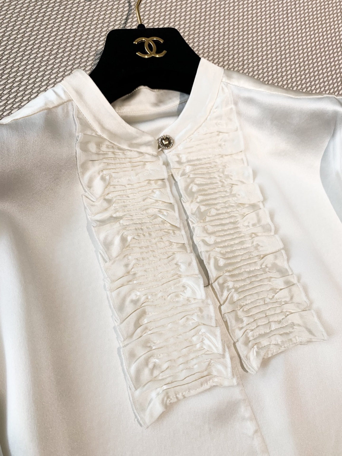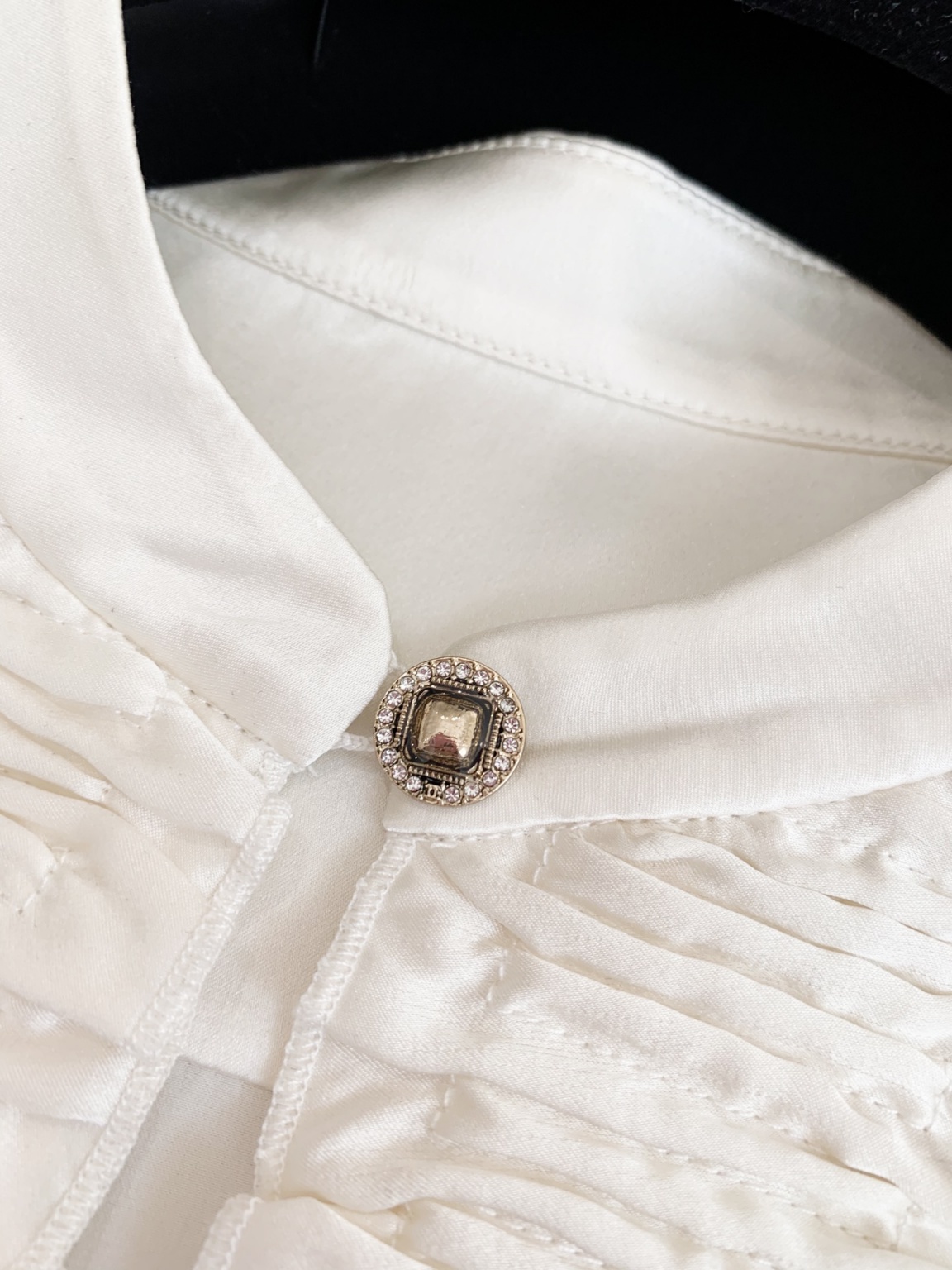 CHANE* 23 프리미엄의류 새틴 실크 화이트 셔츠 맞춤 헤비 새틴 실크 원단 카리스마 입주름 수술 장식으로 화려하게 장식 빈티지 구리 철물단추로 포인트 고급스러움과 화려함이 최고조로 발매