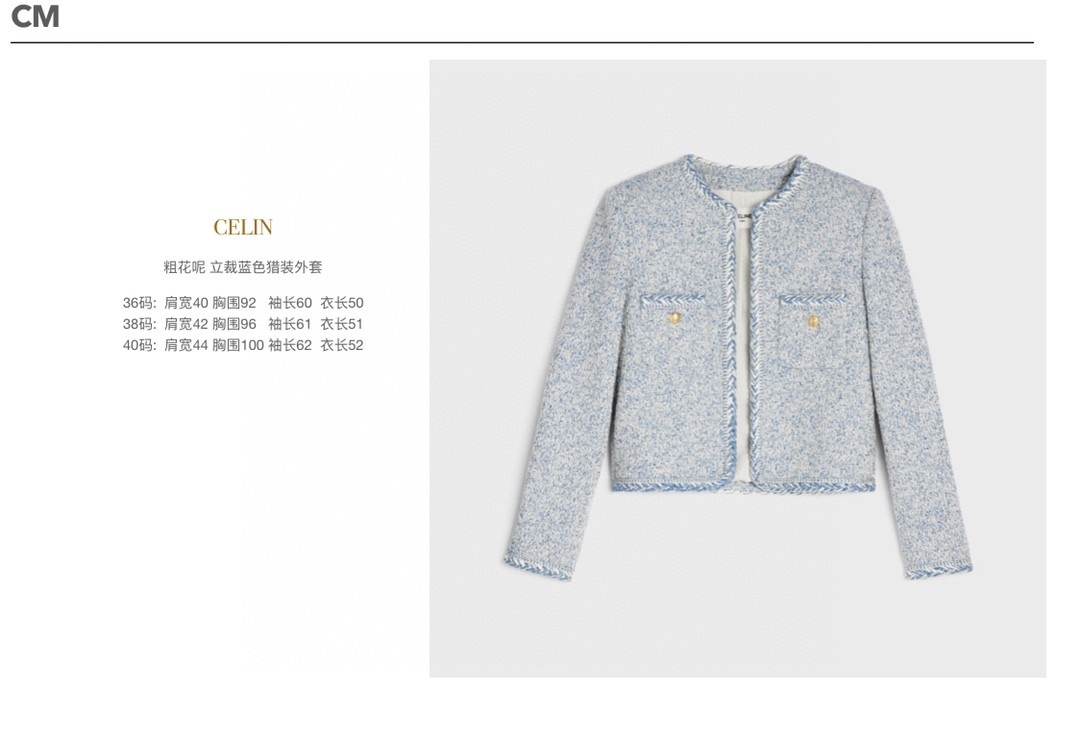 CELIN* 23 봄여름 골드 버튼 인디고 블루 컬러의 스탠자켓 숏 디자인 트위드 원단 플라워 텍스쳐 스트랩 꽈배기 짜임 포인트 실루엣 라인감 개선문 엠보싱 골드버튼 포인트 안감 ce 레터링 자카드 원단