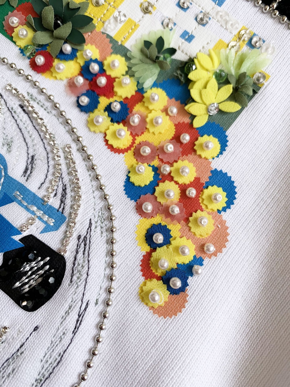 CHANE* 23c 봄여름 자수 레이싱 니트 티셔츠 가슴부위 입체 자수 패턴 디자인 컬러링 포인트 입체 플라워 세팅 큐빅 모티브 핏과 원단 모두 모던한 느낌을 주며, 첫 최고 판매