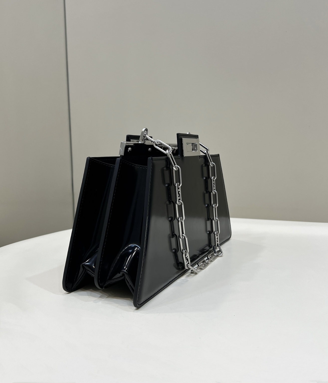 Peekaboo Cut 미디엄 사이즈 클러치 전가죽으로 연출한 Peekaboo의 매력적인 가로 컷팅 디자인 메탈 크로스바와 양쪽의 클래식한 뿔 자물쇠 O'Lock 디테일이 돋보이는 체인으로 토트와 숄더로 연출 사이즈34*18.5*11
