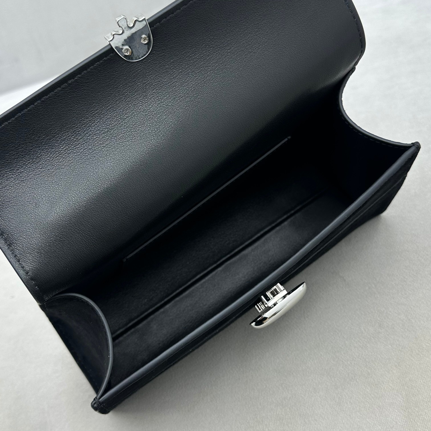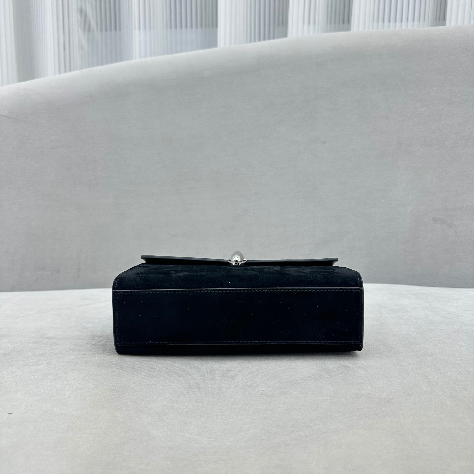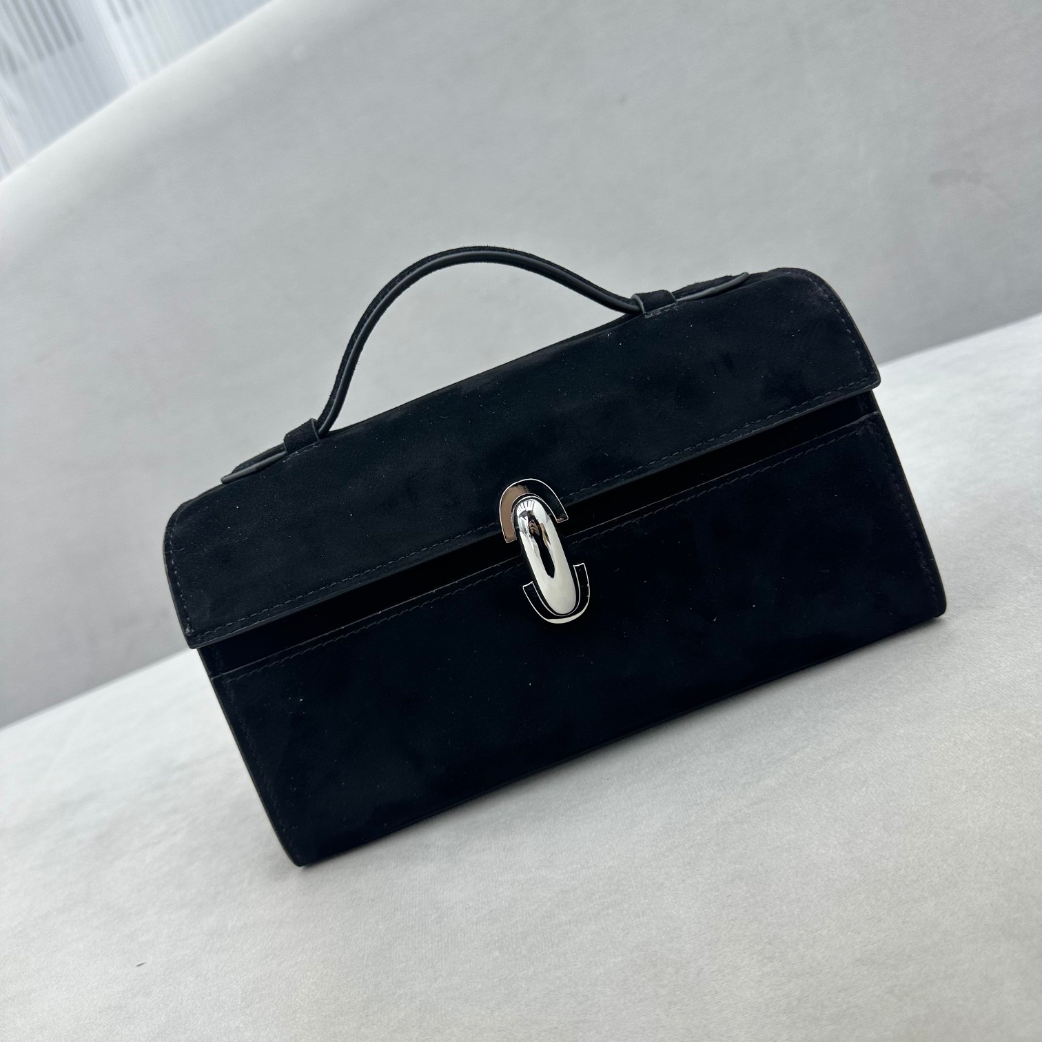 미니멀하고 고급스러운 Savette 더로우 전 디렉터 디자인 브랜드 가죽은 고급스러운 질감과 촉감 시그니처 대칭적인 회전 잠금버튼을 제공 안에 파우치 케이스가 들어 있는 사이즈 통근은 물론 일상에서도 활용가능 사이즈 : 22x12x7cm