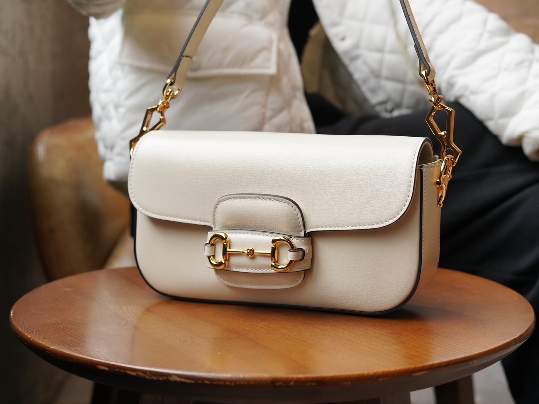 Horsebit 1955 컬렉션 이 디자인 패턴은 브랜드 승마에서 영감을 받아 이중 링과 긴 막대 모양의 두 가지 요소로 구성 오늘날까지 브랜드의 매우 식별 가능한 상징적인 요소 중 하나 사이즈 : 24*13*5.5cm 모델번호:735178
