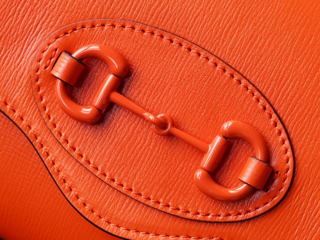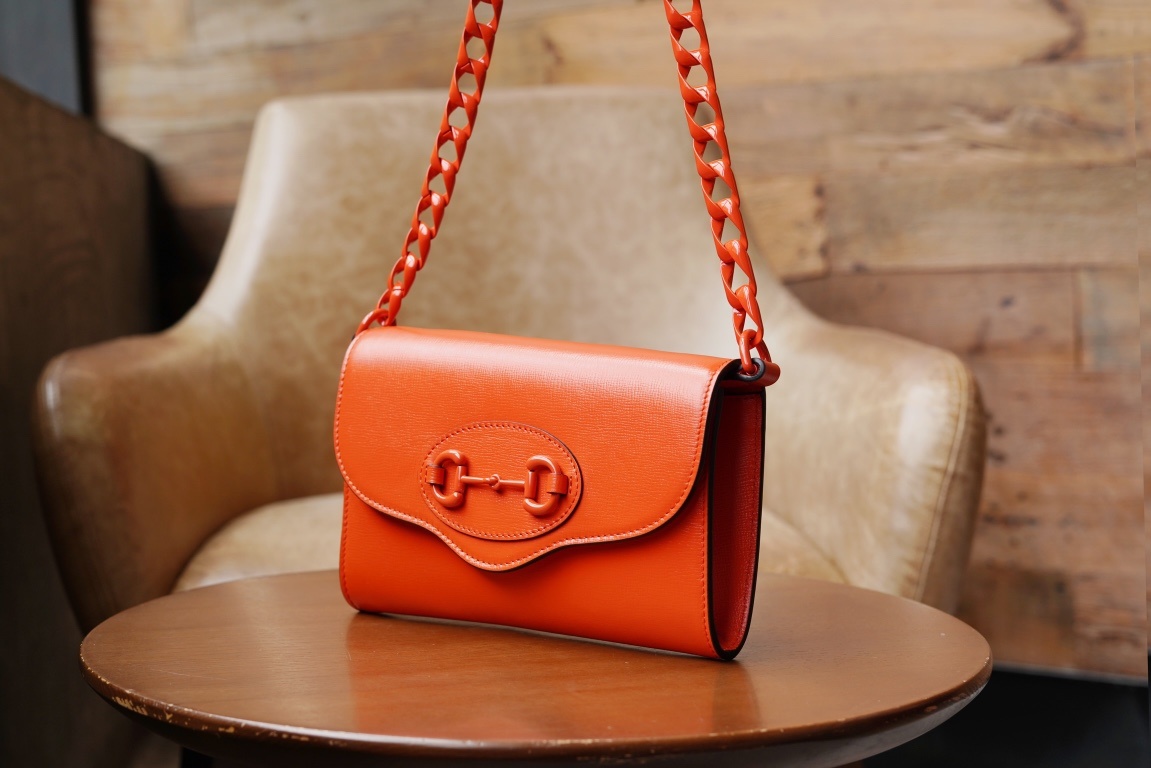 홀스빗 1955 시리즈 체인 가방 오렌지 미니 두 개의 탈부착 가능한 숄더 스트랩 하나는 클래식한 레드 블루 스트랩 디자인 다른 하나는 시인성 있는 Gucc1 체인 디자인 오렌지색 가죽으로 제작 이 시리즈의 상징적인 홀더 버클 액세서리로 장식 사이즈 : 20*12*5.5cm 모델번호:724713