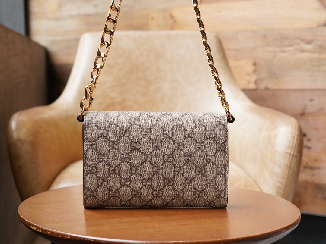 홀스빗 1955 시리즈 체인 가방 캔버스 미니 두 개의 탈부착 가능한 숄더 스트랩 하나는 클래식한 레드 블루 스트랩 디자인 다른 하나는 시인성 있는 Gucc1 체인 디자인 GG 슈프림 캔버스로 제작 이 시리즈의 상징적인 홀더 버클 액세서리 브라운 가죽 롤업으로 장식 사이즈 : 20*12*5.5cm 모델번호:724713