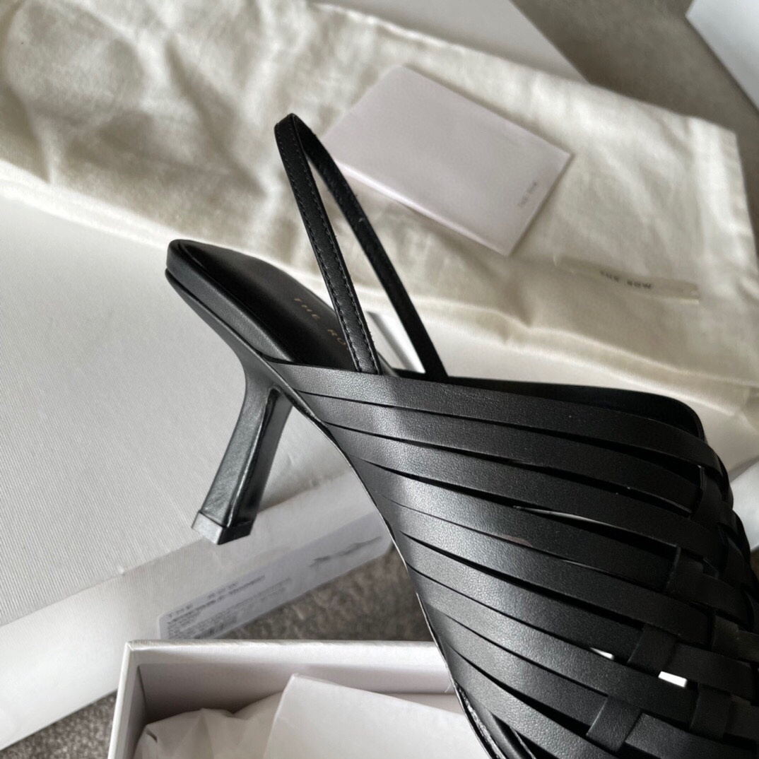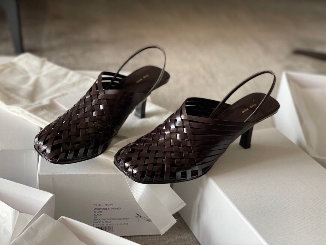 더 로우 프리미엄 23ss 봄여름 신상 소가죽 웨빙 힐 뮬러 매끈한 베지터블 가죽으로 제작 복합적인 핸드메이드 스트랩과 염색된 에나멜 힐을 매치 송아지 가죽으로 순수 수작업으로 짜는 공정 이태리 수입 중 바닥이 안정적이고 잘 변형되지 않으며 이태리 수입 가죽 베이스 굽:7cm