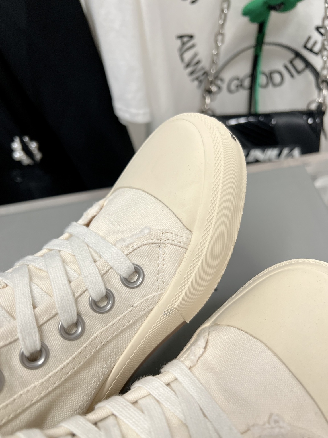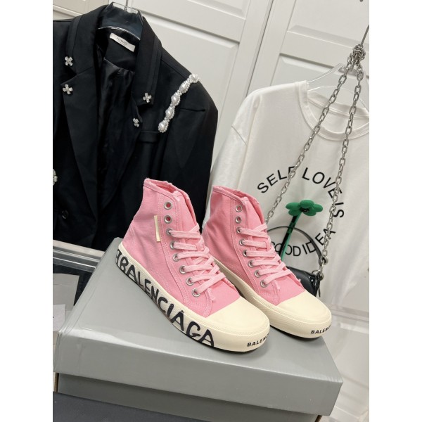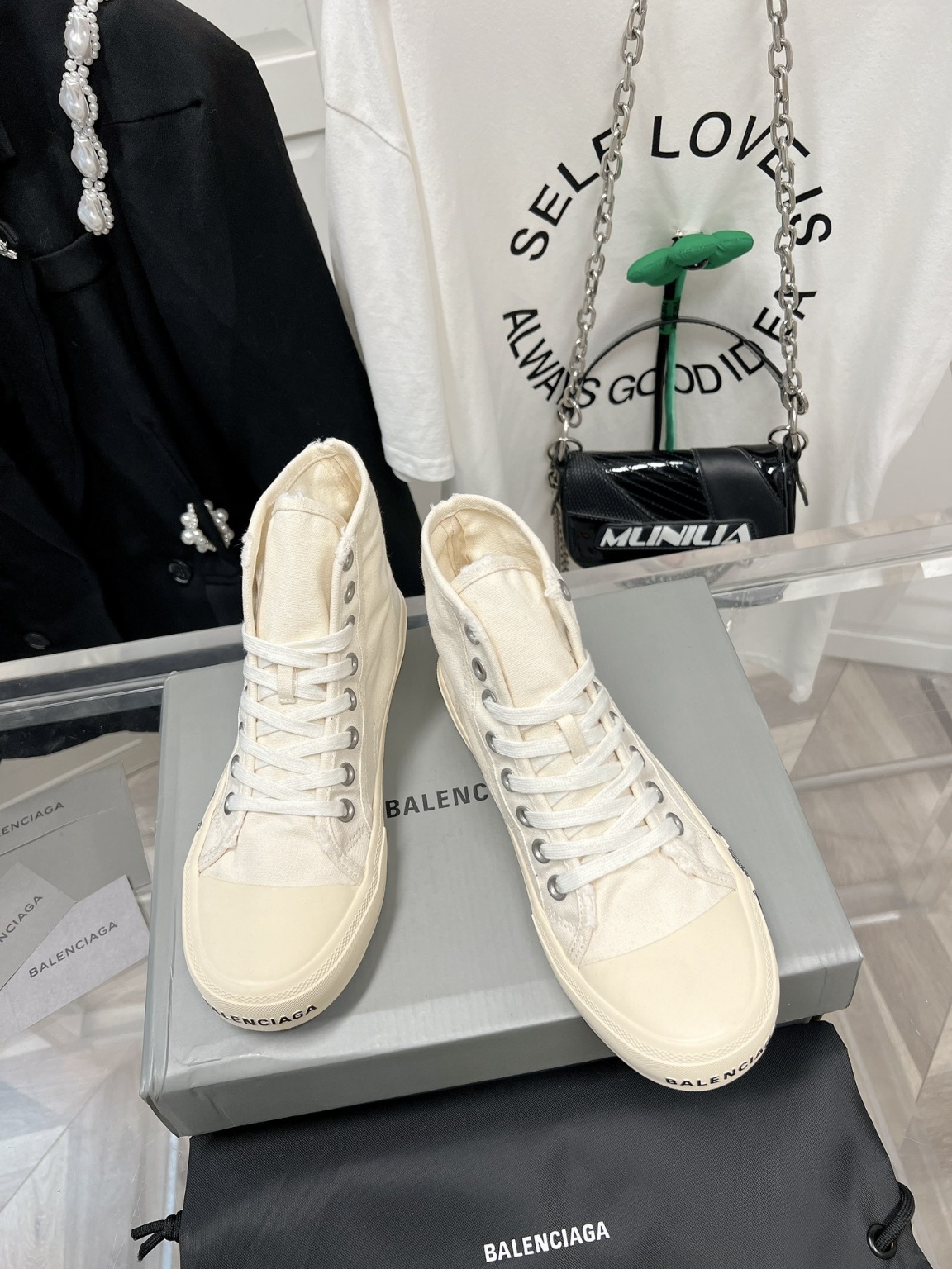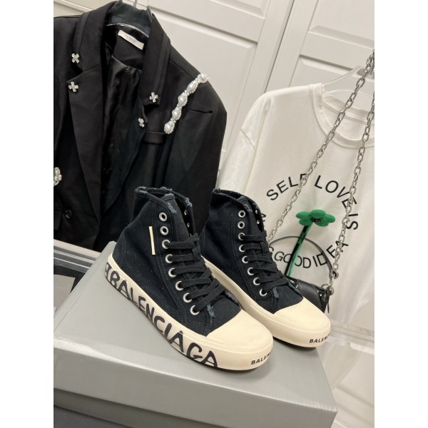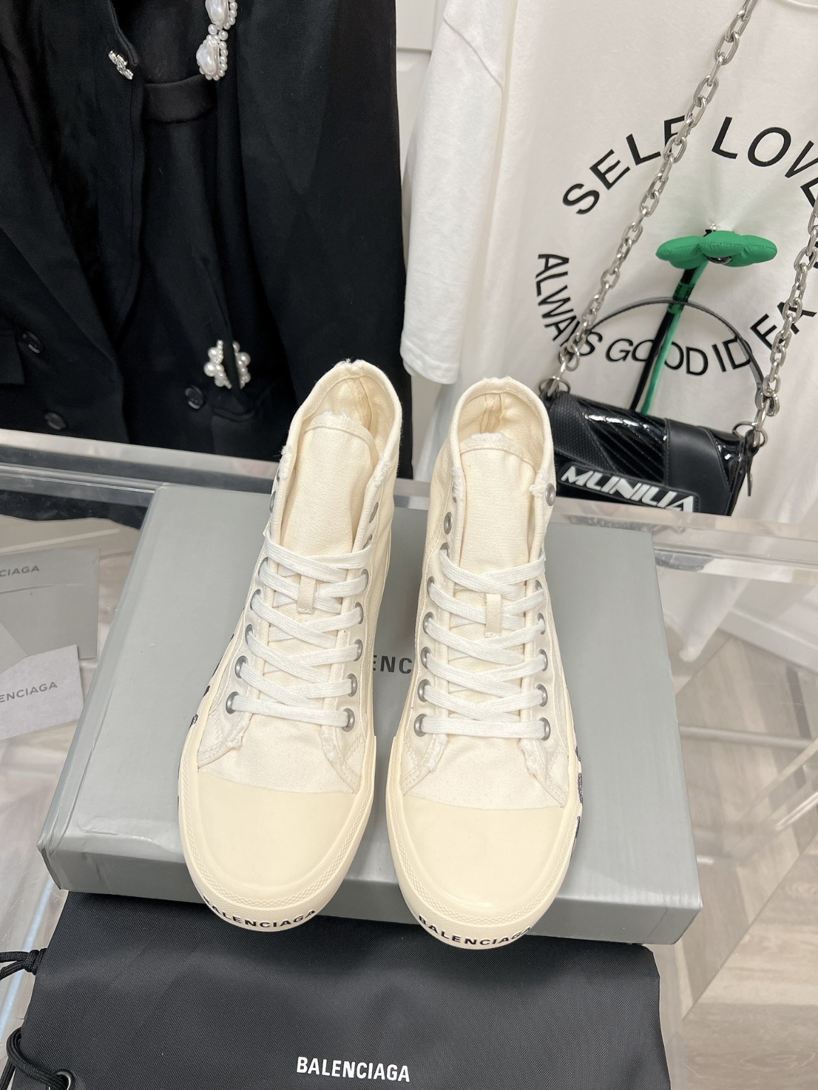 발렌시아가 파리지아 스니커즈 파리커플 복고풍 구제 스타일로 앞코에 브랜드 로고 굽에 야드 스틸 프린트 캔버스 신발에 워싱 염색 구제 색칠 공법이 적용 오리지널 투톤 콤비네이션 빅 바닥 불규칙한 색칠/ 불규칙한 찢김/ 불규칙한 주름