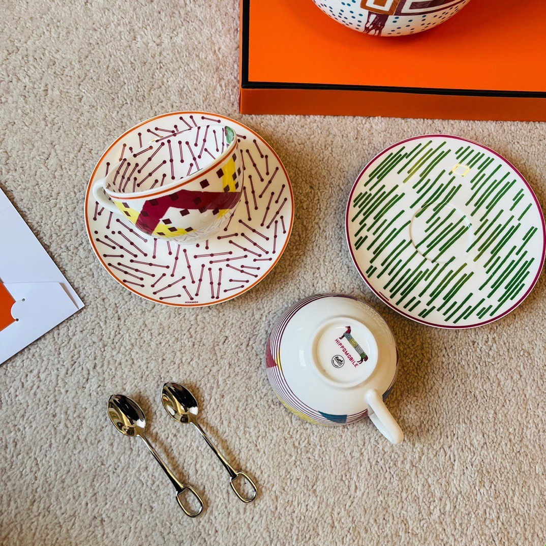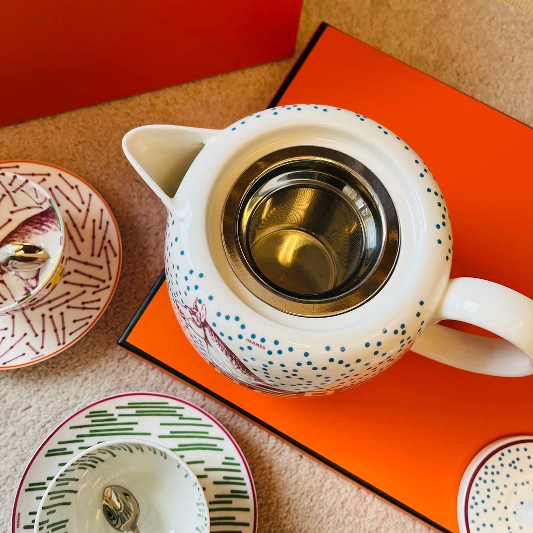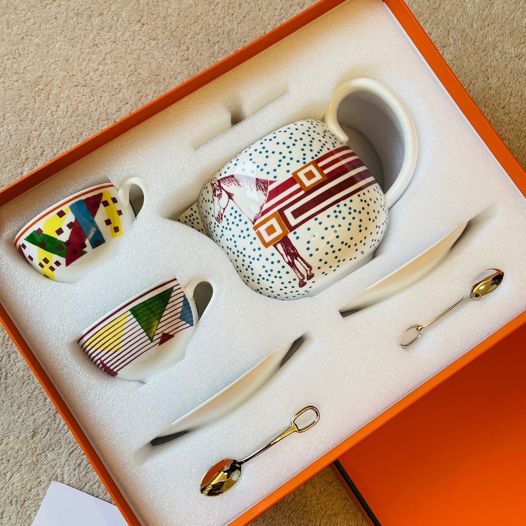 Her*mes·Hippomobile 매장의 신상품 라인 아티스트 Gianpaolo Pagni는 라이더 실크와 카툰의 세계에서 영감을 받아 매우 어린이스러운 디자인을 창조 기하학적인 요소를 쌓아올려 컬러 대비가 선명 구성: 커피포트1 커피잔2 커피접시2 커피스푼2