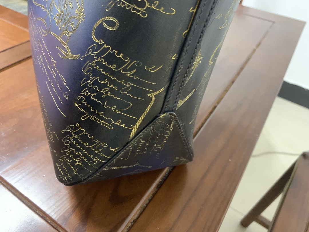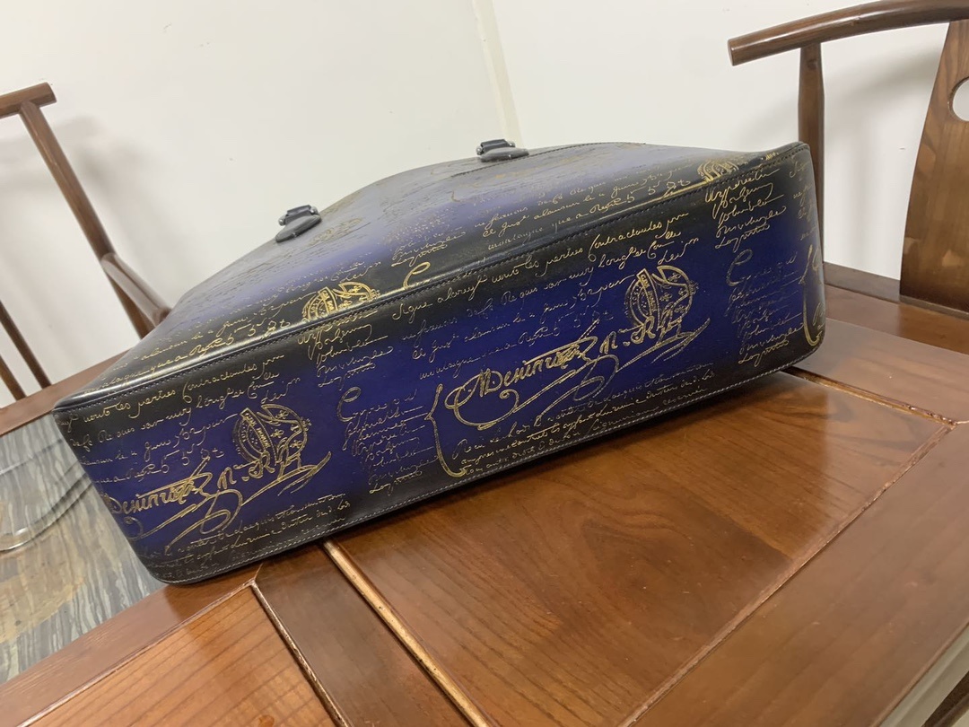 BERLUTI Toujours Scritto 패턴 가죽 토트백 Berluti는 듀스쥬르와 트루아누이츠 두 종류의 가죽 서류가방을 출시 브랜드 최초의 베네치아 가죽 컬렉션 Toujours 토트백은 데일리하게 사용하기 좋은 실용적인 가방 공예 : 핸드메이드 금도금 외부 특징 : 1개의 패치로 '고은색' 표면처리가 된 황동철물 내부 특징 : 지퍼팩 1개, 스티커팩 1개, 핸드폰팩 1개, 키링 1개 사이즈 높이: 31cm - 폭 46cm - 두께 13cm