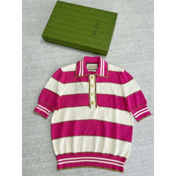 GG 로고는 다양한 칼리지 스타일의 니트 초대형 스타일링으로 표현되어 있으며 풍부한 배색으로 일상적인 스타일링에 활력을 부여 캐주얼한 디자인, 핑크와 아이보리 스트라이프 GG 코튼으로 포인트 골드 실버와 실버의 실루엣을 절묘하게 녹여낸 면 반팔니트