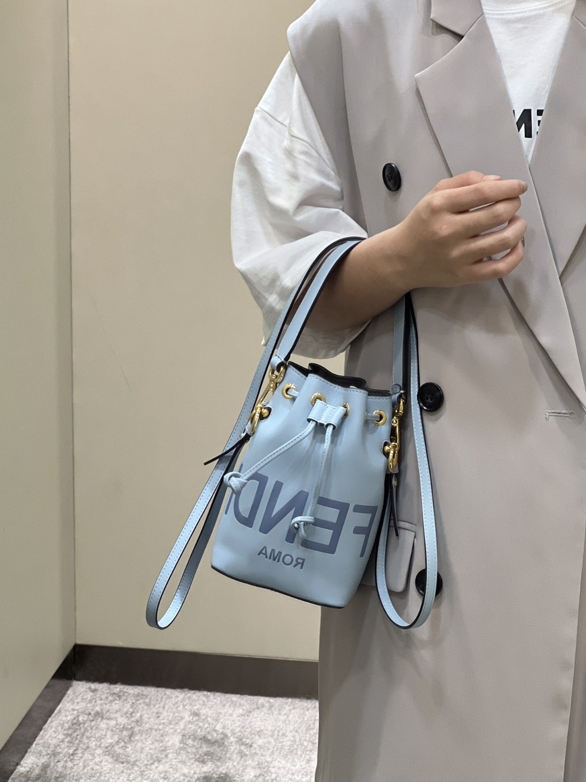 FENDI Mon Tresor 미니 버킷백 이태리 송아지가죽으로 제작 "FENDI ROMA"라는 클래식한 레터링을 핫스탬프 스트링 여밈 디자인에 길고 짧은 두 개의 어깨끈을 매치 컴팩트한 핏의 대용량 size 18×12×10cm