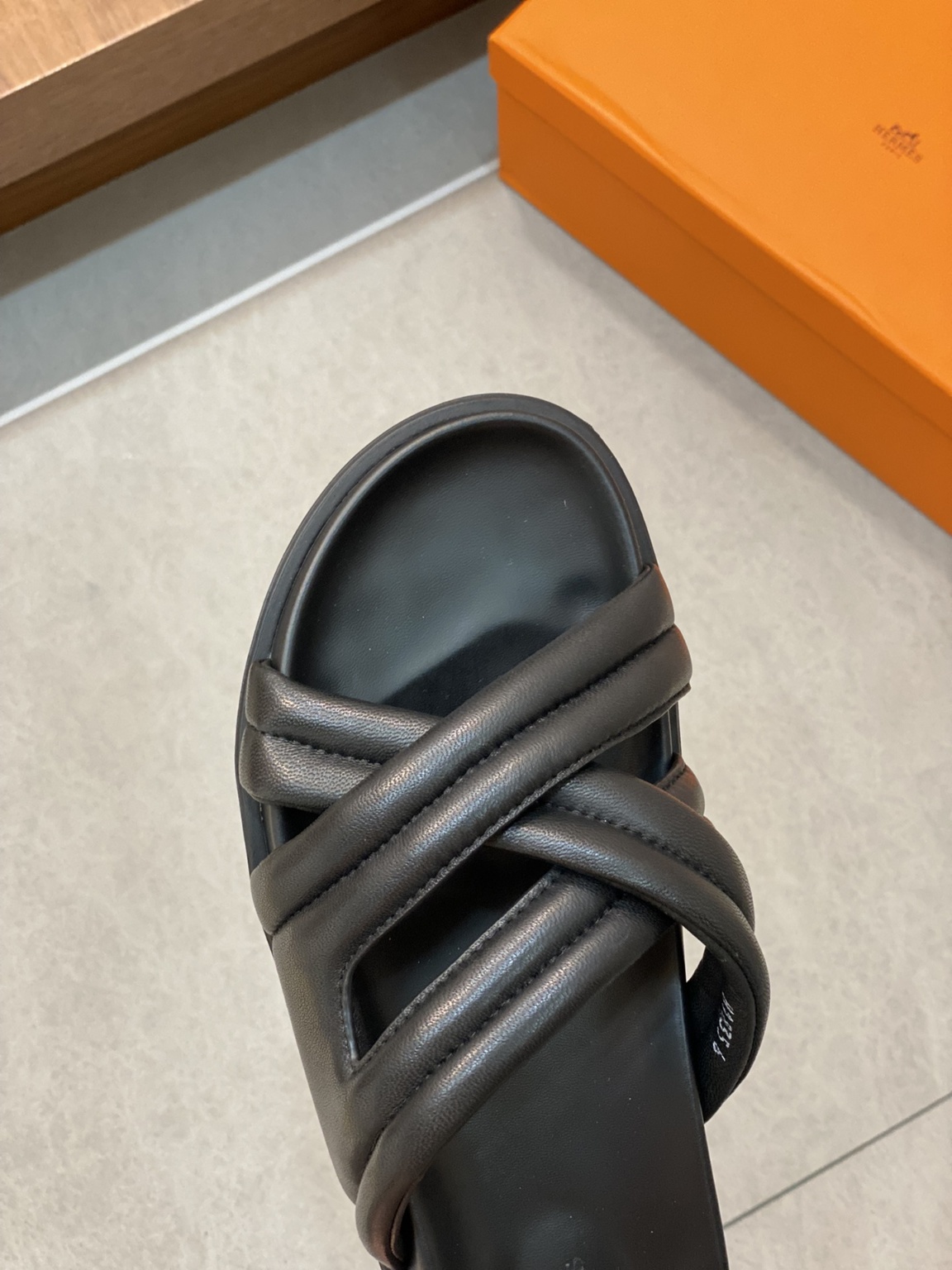 에르메스 슬리퍼 -프리미엄 품질 원단 -신발· 원판 실크 송아지 가죽 -안감· 프리미엄 소가죽 -바닥· TPU 발포수대 · 고무 : 조립 성형바닥 -초고품질 · 세공
