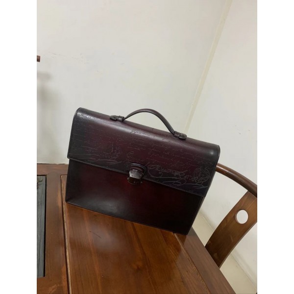 Berluti 토트 서류가방 베네지아 글로리아와 스크리토 가죽으로 제작된 경량 서류가방 잠금 덮개가 있어 두 번 누르면 열리며 러브레터 무늬가 조각되어 천연고법 핸드메이드 비즈니스 캐주얼, 스타일리쉬한 스타일! Size:38×28×7