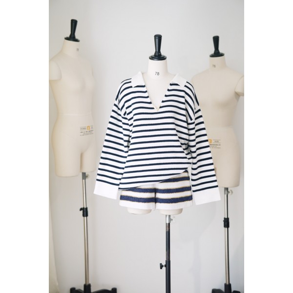 VALENTIN* 23하 니트 브이넥 스트라이프 숄더 스판 비스코스 섬유로 제작 브이넥으로 포인트를 주었으며 드롭숄더 네크라인이 나른한 핏 최고 버전 발매