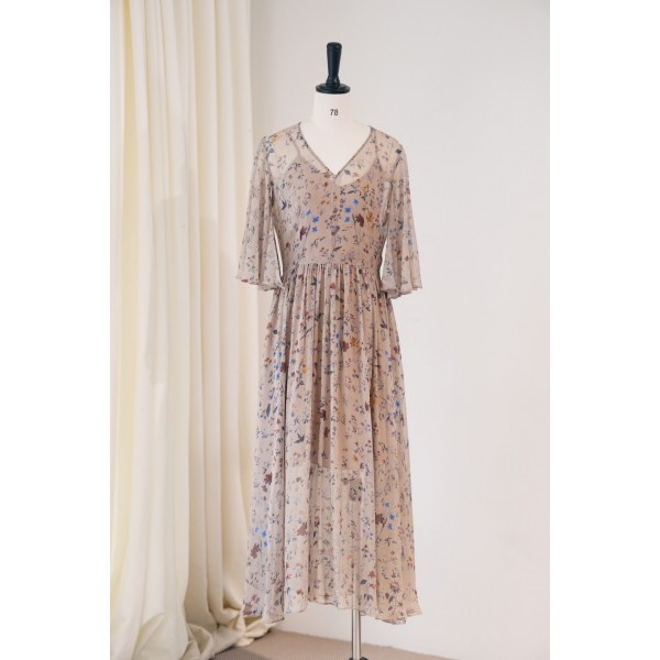 DIO* 23 여름 플라워 실크 주름 원피스 실크 원단을 사용한 입재 디자인 그레이 핑크 계열의 부드럽고 화사한 플라워 패턴 치마 소매 슬릿이 날렵한 자태를 뽐냄 첫 번째 최고 버전 발매