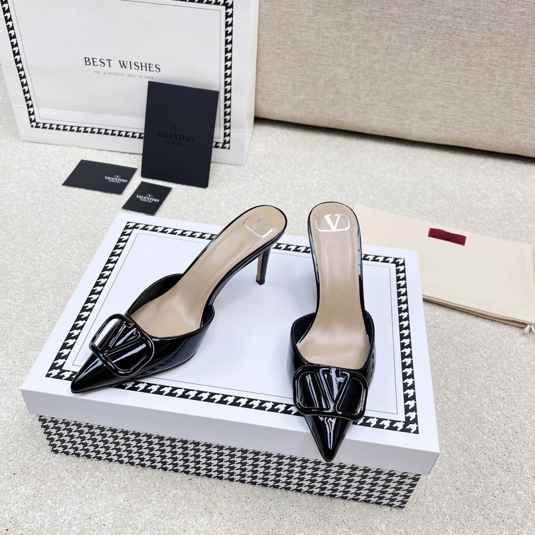 VALENTINO 최신 브이로그 버클 슬리퍼 독점 오리지널 1:1 개발, 오리지널 없이 불입 V-LoGo 버클, 소재: 수입 에나멜 안감: 전립면 양가죽, 가보시:이태리 투염 소가죽 중창: 이태리 오리지널 공예 소재 공예: 컴퓨터 차선, 기계 세팅 굽:4.0 / 8cm