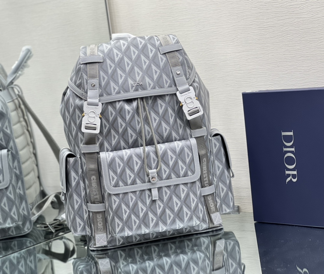 이번 시즌의 새로운 스타일인 디올 히트 로드의 백팩 디올 그레이 CD Diamond 패턴의 캔버스로 세심하게 제작 마크 보앙(Marc Bohan)이 1974년에 디자인한 CD 다이아몬드 패턴 "CD"의 이니셜을 입체적인 라인 마름모꼴로 재해석하여 면 캔버스로 제작, 디올 그레이 매끄러운 소가죽 전면 메탈 코팅 황동 "DIO" 로고, 안쪽에 'DIO' 엠보 로고 크리스티아누 디오 나일론 자카르 밴드, 플랩과 스트링 여밈 알루미늄 버클에 "Christian Dio" 로고와 "CD" 이니셜 가죽과 패딩 메쉬로 어깨끈 조절 가능 등판은 메쉬 패브릭으로 보강하여 "DIO" 로고와 매치 내부 노트북 파티션 사이즈:43 x 51 x 20 cm