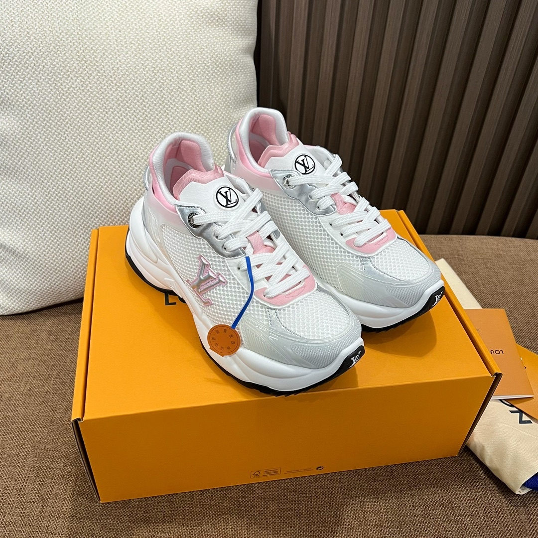 LV RUN 55 키높이 운동화 순수입 DK 통기성 메쉬 원단과 통기성 극세사 투명한 tpu 컷팅으로 제작되었으며 멀티 소재 패치 약 3cm의 솜털 깔창은 당신이 달리기, 산책, 운동할 때 아주 좋은 쿠션감을 제공해 주며 발은 매우 부드러움 안감 역시 통기성 있는 원단으로 맞춤 제작