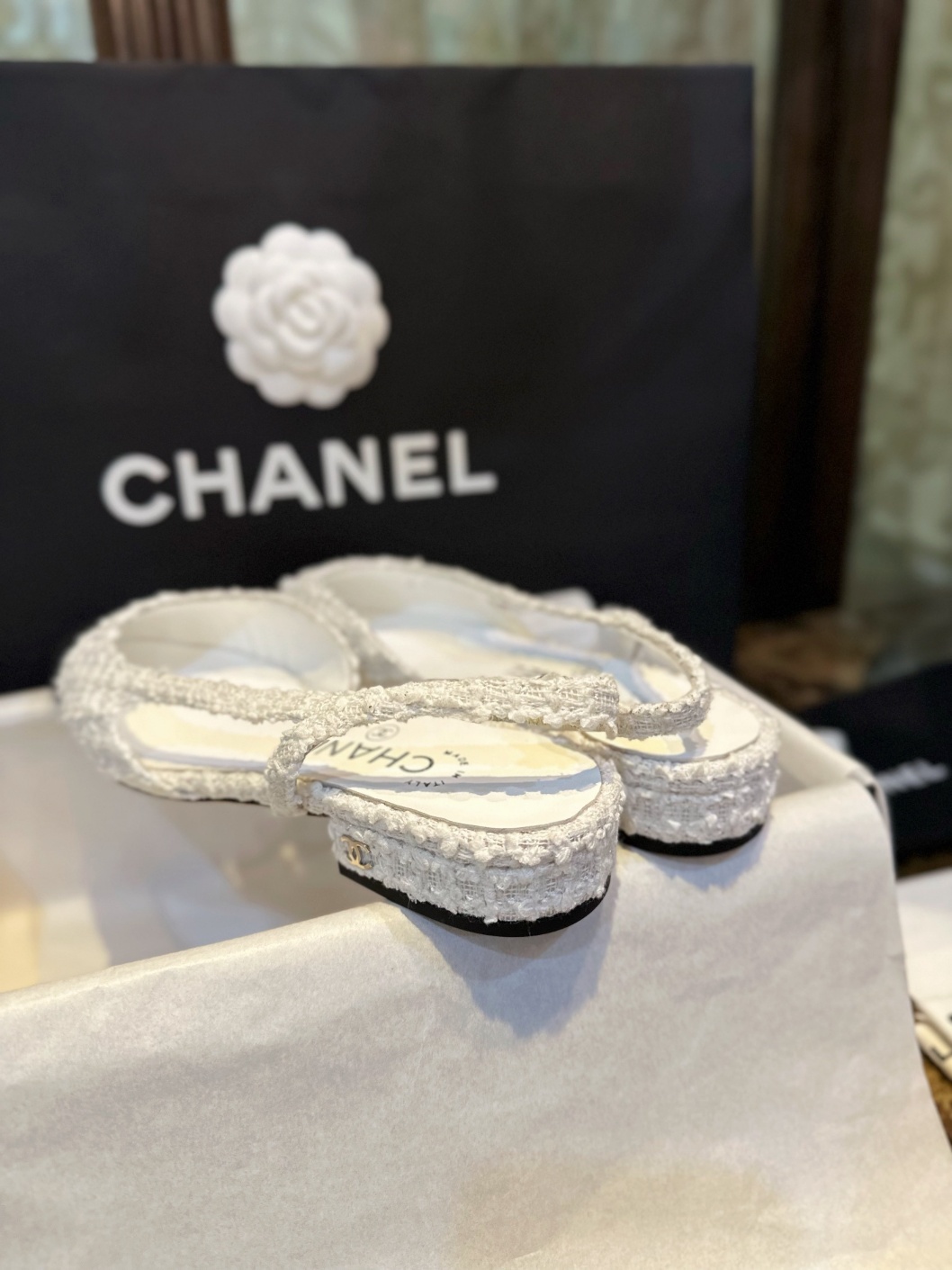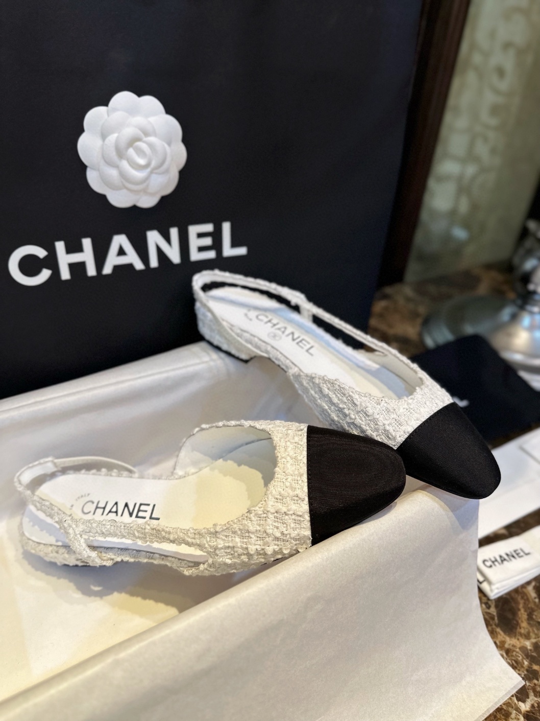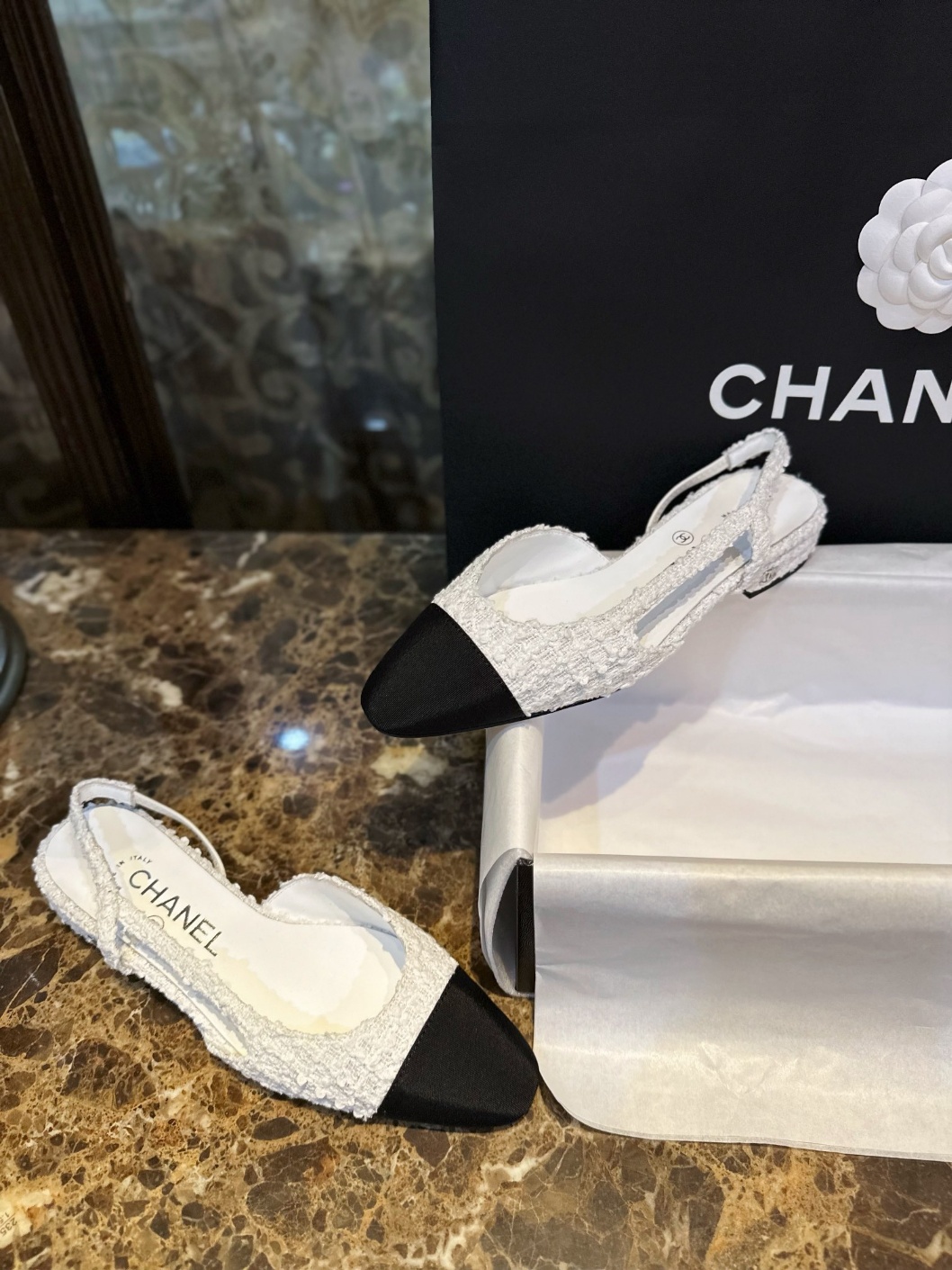 스웨이드 화이트 트위드 플랫 슬링백 이런 청량한 아름다움이 너무 좋아요 심플한 컬러일수록 마음에 쏙 걷는 내내 지적인 여유로움 가득 카리스마 부여