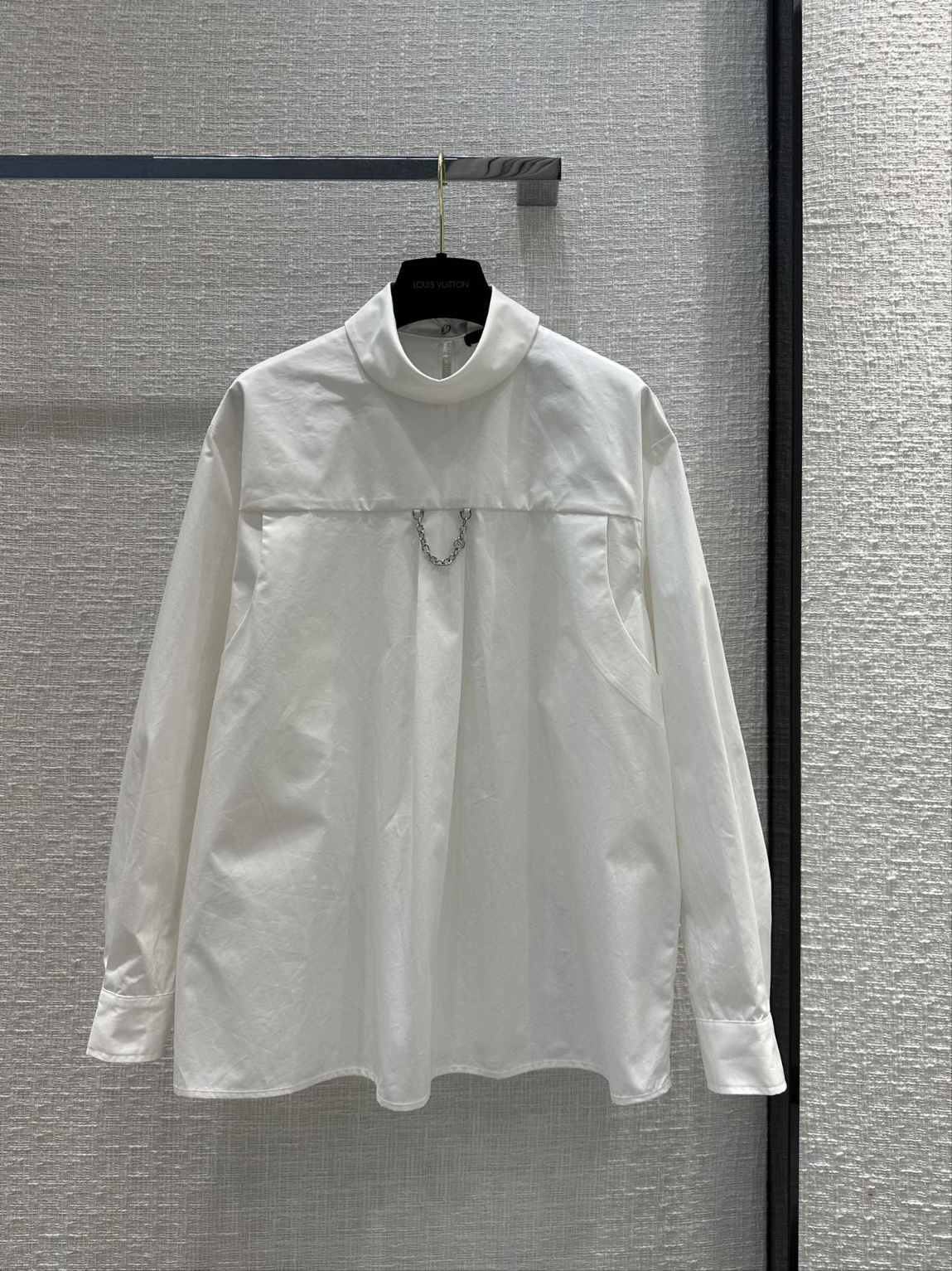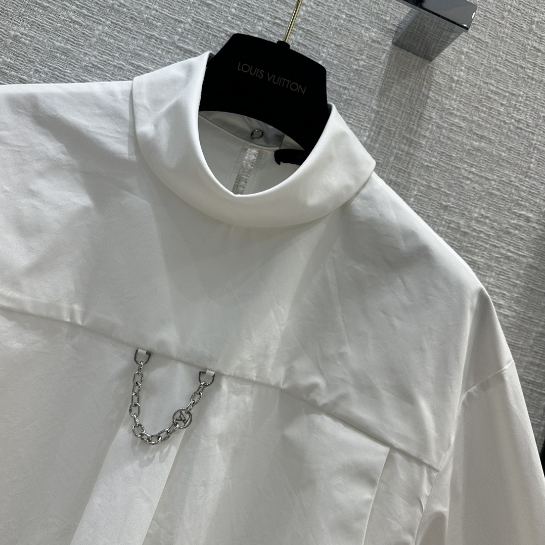 루이비통 23 가을겨울 신상 디자인 감각이 뛰어난 화이트 셔츠 앞면에는 하이넥과 LV 이니셜의 체인이 장식되어 있으며 뒷면에는 우아한 오프닝이 있음 전통적인 셔츠 컨셉을 깨고 우아하고 캐주얼한 프렌치 스타일링 오리지널 커스텀 액세서리 L사이즈 가슴둘레 112, 총기장66