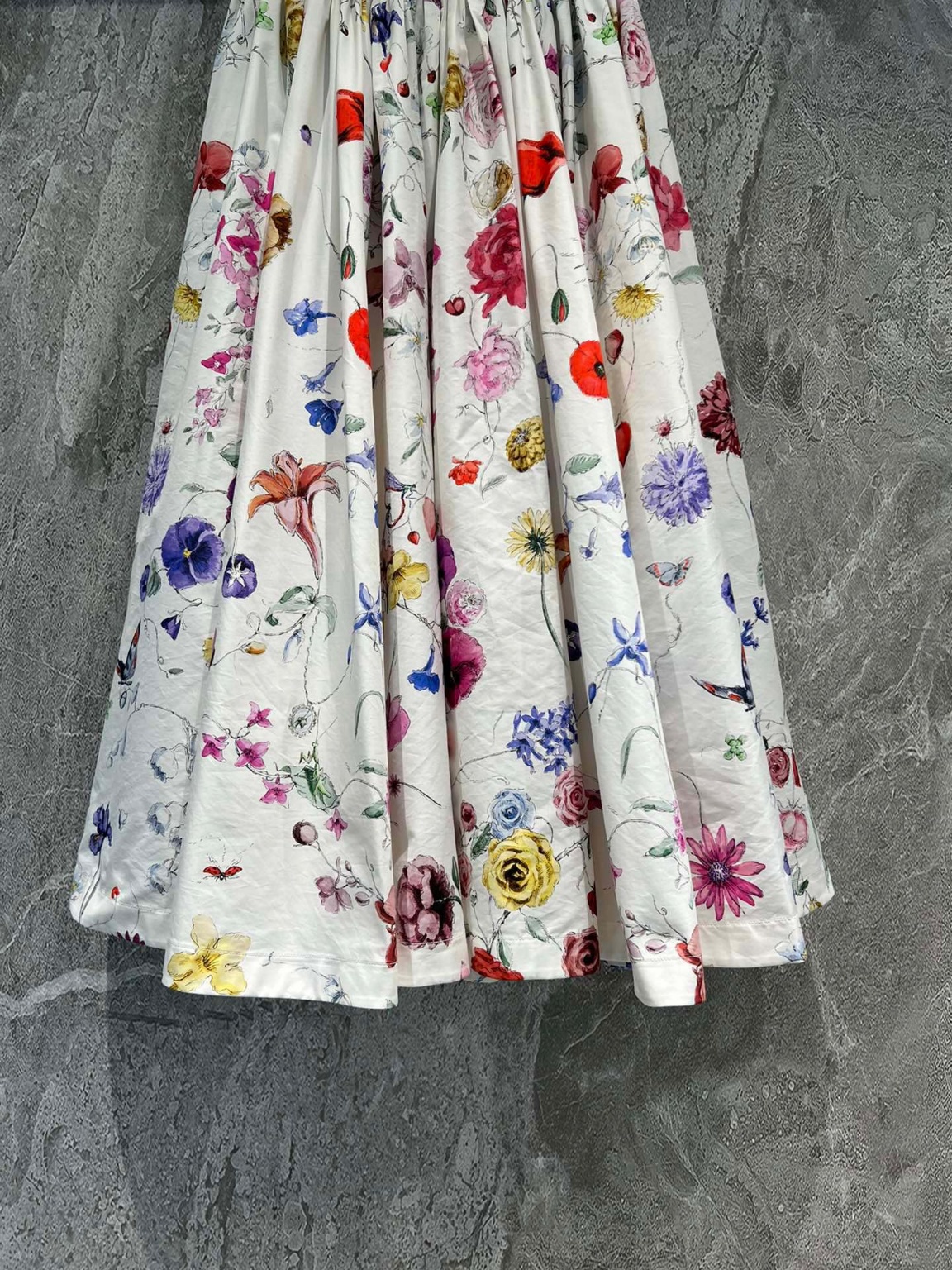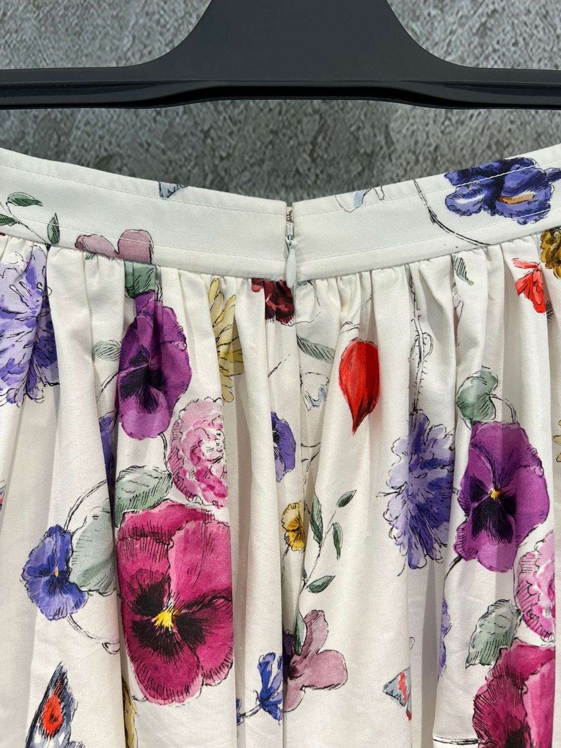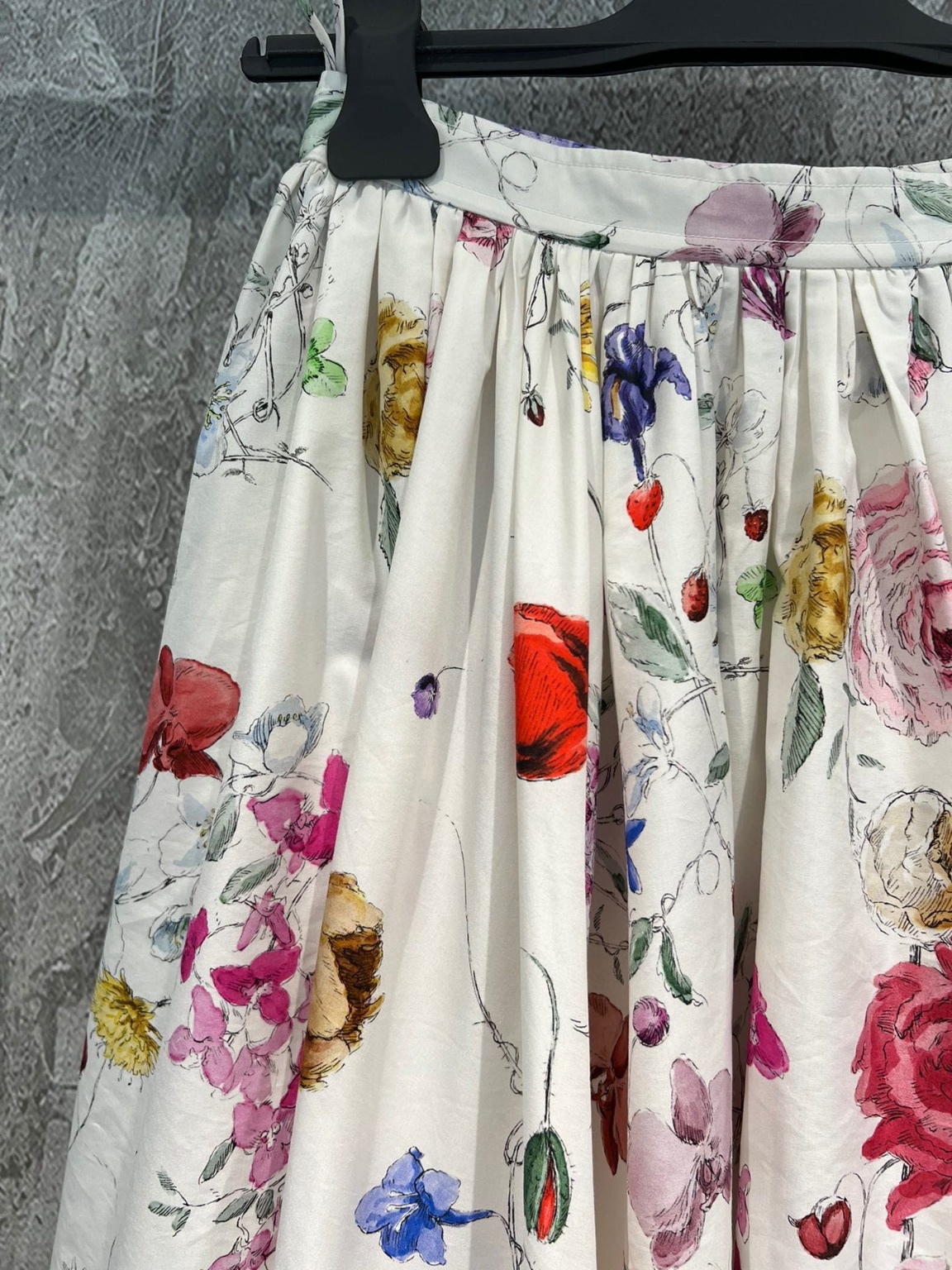 2023 FW 바캉스 하프 스커트 화려하고 우아한 꽃의 세계를 표현하며 자연스러움을 느낄 수 있는 식물 문양 면+실크 혼방 원단으로 정성스럽게 제작 플레어형 재단용 소재가 5장씩 접합되어 있으며 소재 5.2m 원가 절감을 위해 치맛자락을 축소하는 것은 필요 없음