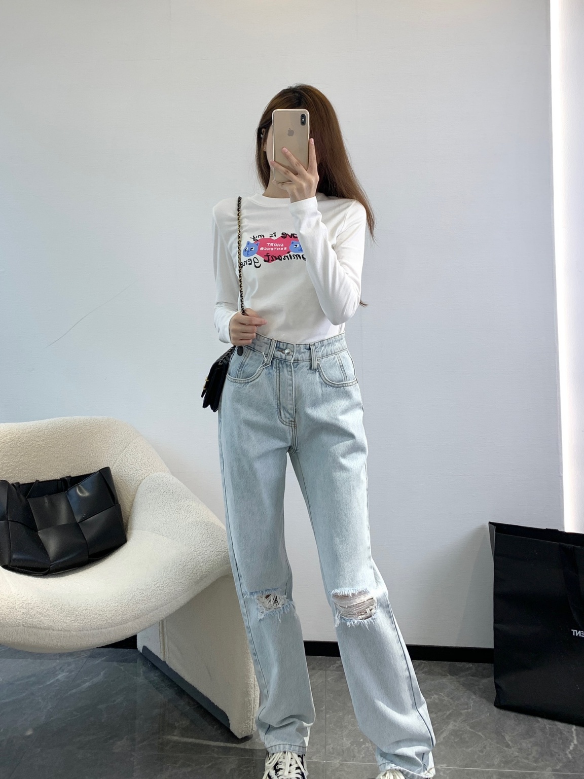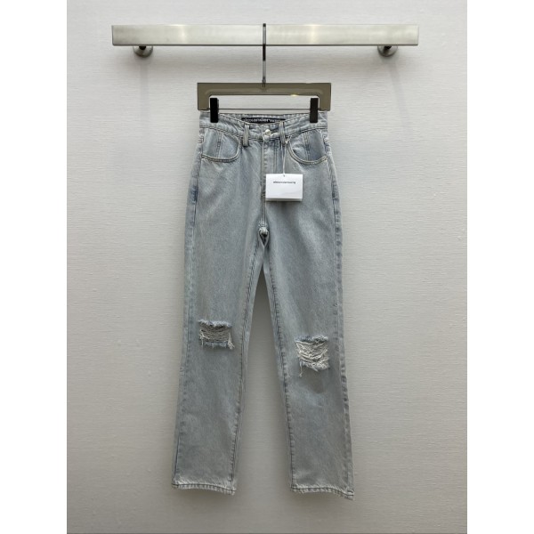 Alexander Wang 23 초가을 신상 데님 팬츠 단독 몰드, 오픈 짜임, 염색 워싱 공법, 수입 데님 면 원단 부드럽고 편안한 양 무릎 개성 대미지 디자인 쿨한 뒷허리 소가죽 브랜드 패치 하이웨이스트 핏 날씬해보임, 커스텀 철물 부품 품질 디테일 보기