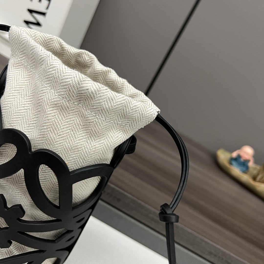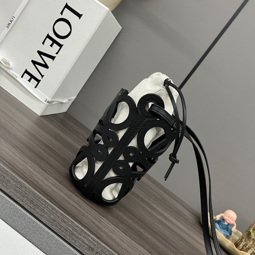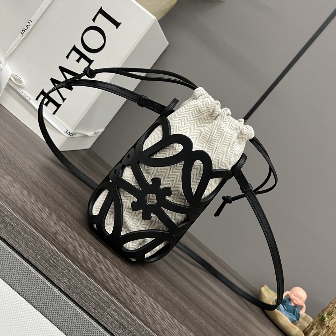 로에베 포켓백은 클래식 소가죽과 캔버스 Anagram 패턴의 펀칭 소가죽으로 제작 소가죽 스트랩과 헤링본 형태의 면 캔버스 스트랩이 포함 크로스 사이드 소가죽 스트링 size:12*7*21CM