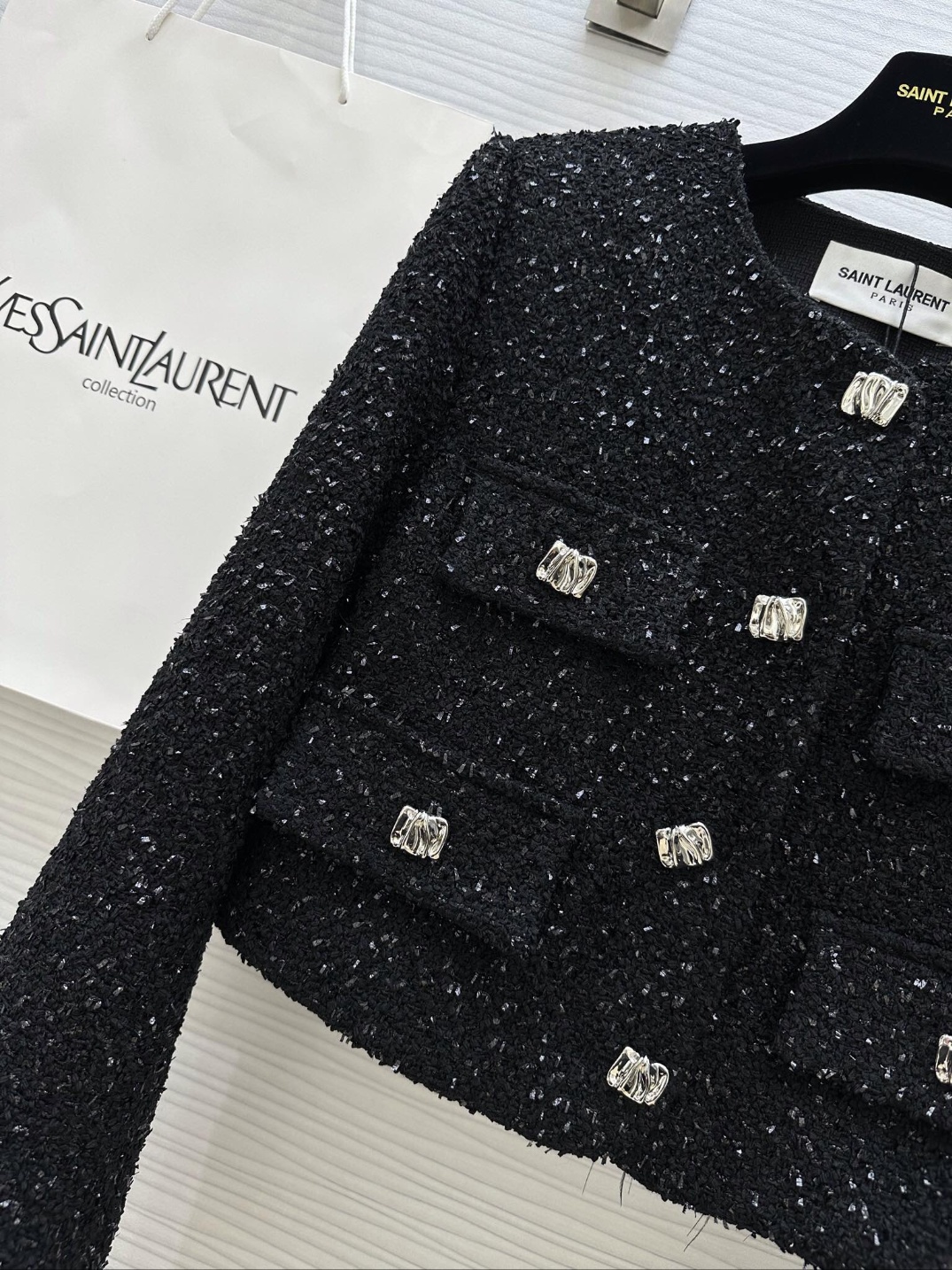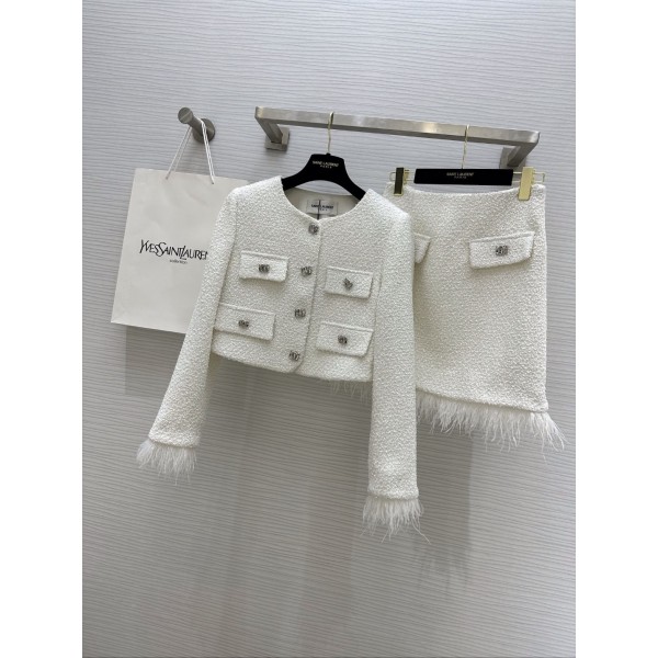SAINT LAURENT 23 가을 겨울 신상 타조 퍼 세트 소매 스팽글 페미닌 코트+타조 퍼 스팽글 하프 스커트 고급스럽고 우아한 여성스러운 세트 탈부착 타조 퍼, 주문제작 수입 스팽글 트위드 원단 고품질 맞춤 M사이즈 어깨너비:37, 가슴둘레:94, 총장:45 치마 허리둘레:70, 엉덩이둘레:92, 치마길이:92
