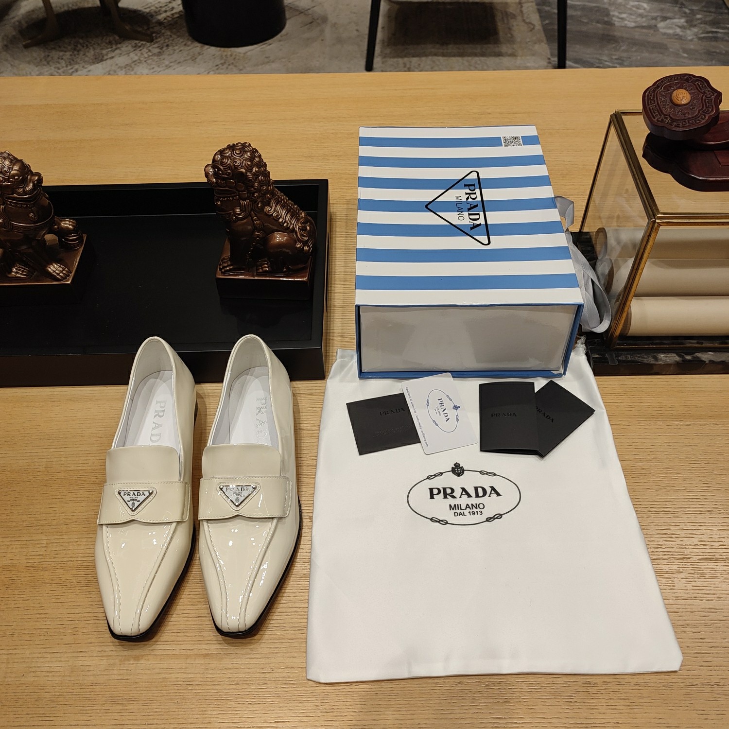 최상위 패키지 최고 버전 프라다 2023 최신형 납작한 굽의 스퀘어형 단화 브랜드에서 보기 드문 롱 스퀘어 형태의 에나멜 플랫 슈즈 라인 오리지널 초소프트 소 에나멜 가죽 심플해 보이지만 제작이 매우 어려우며 오리지널 헤드라인 골격+클래식 프라다 로고 금속 철물 버클 세팅 롱롱한 스퀘어 앞코와 빅 플랫 힐의 결합 이태리 공예에서 대저로 제작되어 절대적인 튼튼한 분량 굽 3cm 독점 24년 블루 스트라이프 매장 회원 한정 자석 케이스 포장 라이트 에나멜 원단+양가죽 내피+이태리 트리플 A급 소가죽 베이스
