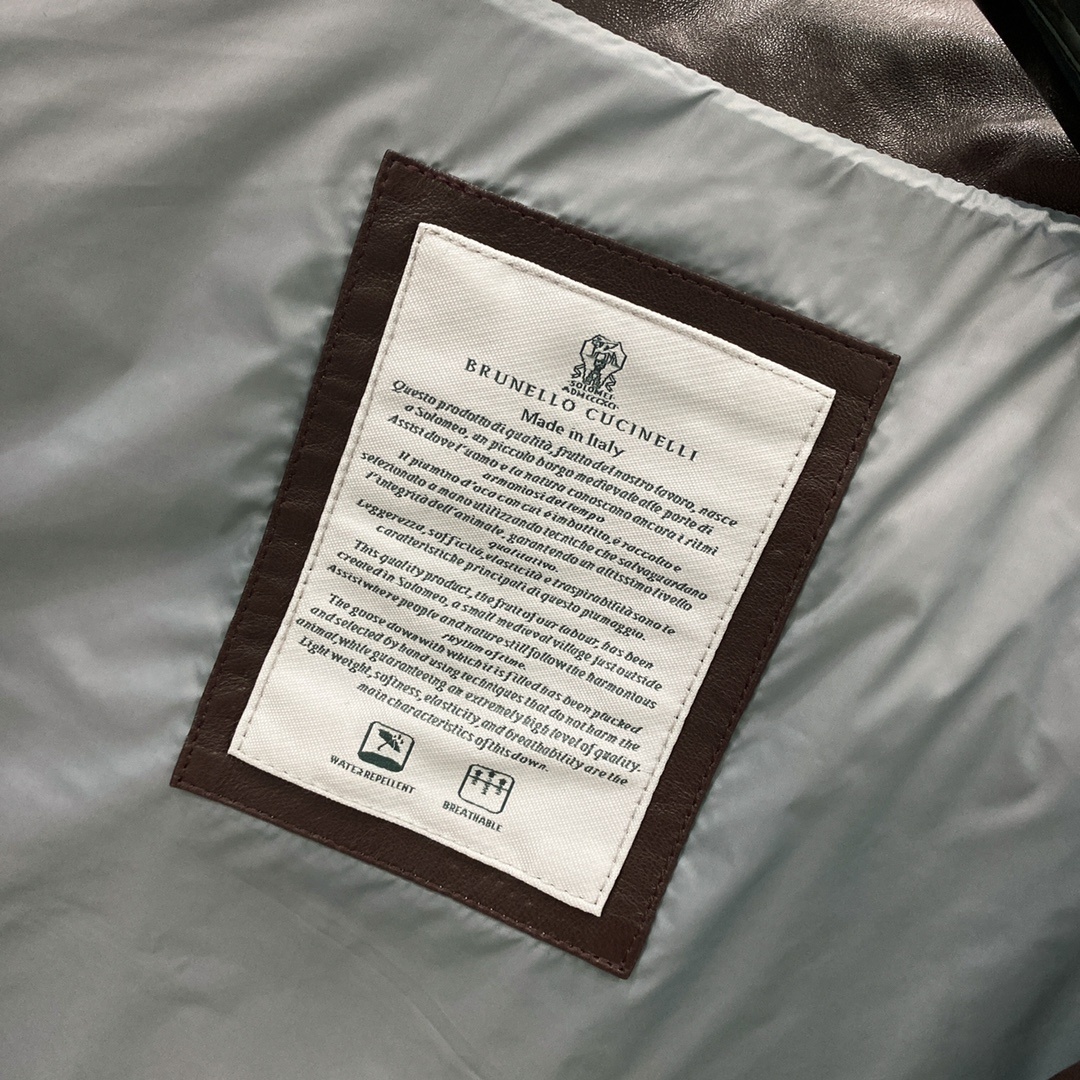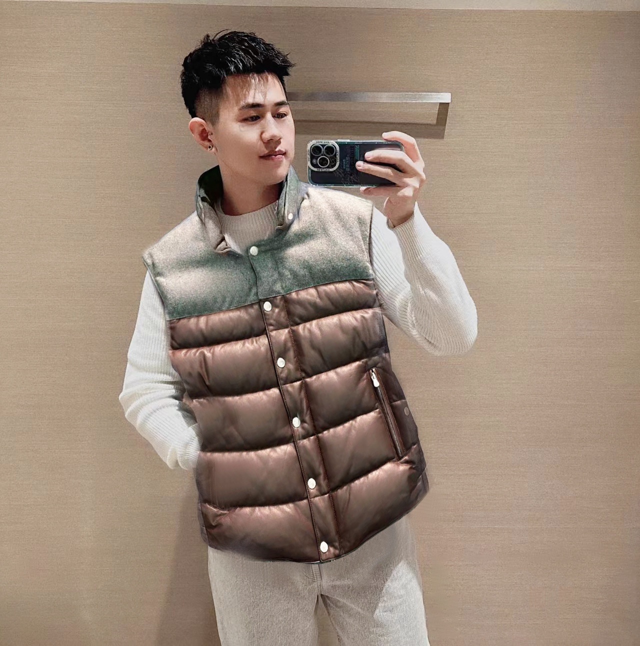 브루넬로쿠치넬리 남성 양털 패치 양가죽 패딩 베스트 맞춤형 알루미늄 철물 및 버클 오리지널 맞춤 스페인 수입 양가죽 오리지널 정직 울 패치 원단 오리지널 독점 개발 철물 버클 내부 충전 dist 유럽 기준 구스다운 90%