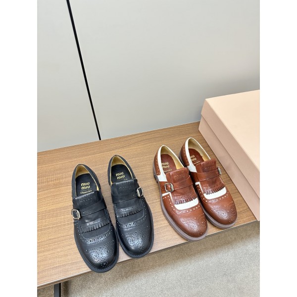 미우미우&처치즈 콤비 더블 브록 슈즈 Miu Miu는 슈즈 브랜드 Church's와 함께 2023 가을 겨울 콜라보레이션 컬렉션을 선보이며 브랜드 고유의 정장 스타일과 Miu Miu 브랜드가 지닌 자유로운 정신을 조화시킨 브록 슈즈의 클래식한 날개 끝 패턴이 Church's의 잉글리시 룩을 연출한다고 발표함 겉감 완전 맞춤 컬러 스크럽 송아지 가죽 + 테크노 캔버스 안감 염소가죽 오리지널 오픈형 Ip 러버솔