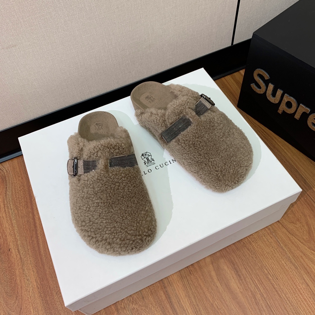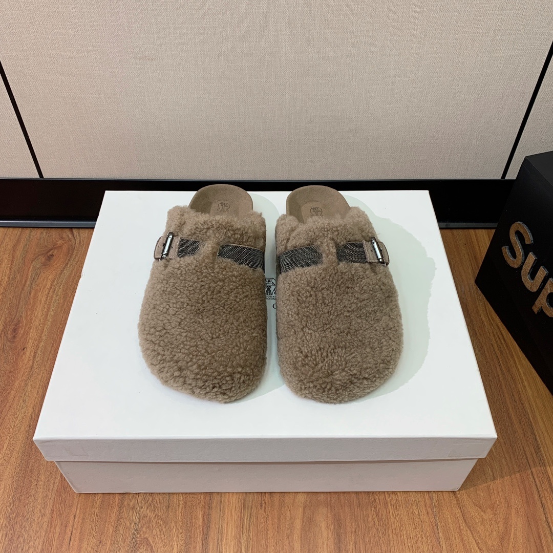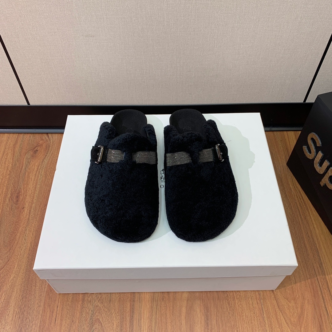 브루넬로쿠치넬리 양털 뮬 슬리퍼 양털 신발 표면+순수 핸드메이드 탠덤 비즈 체인 액세서리 고무 밑창