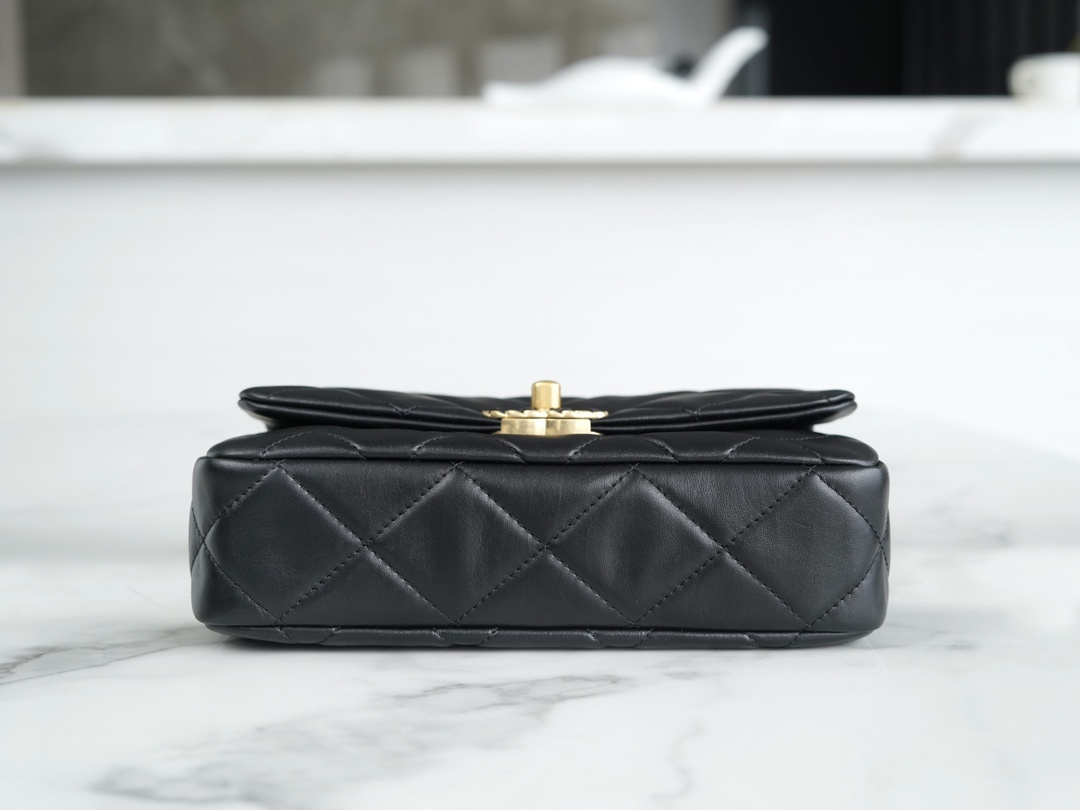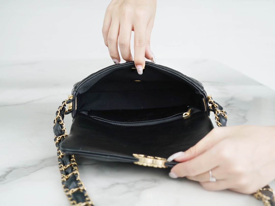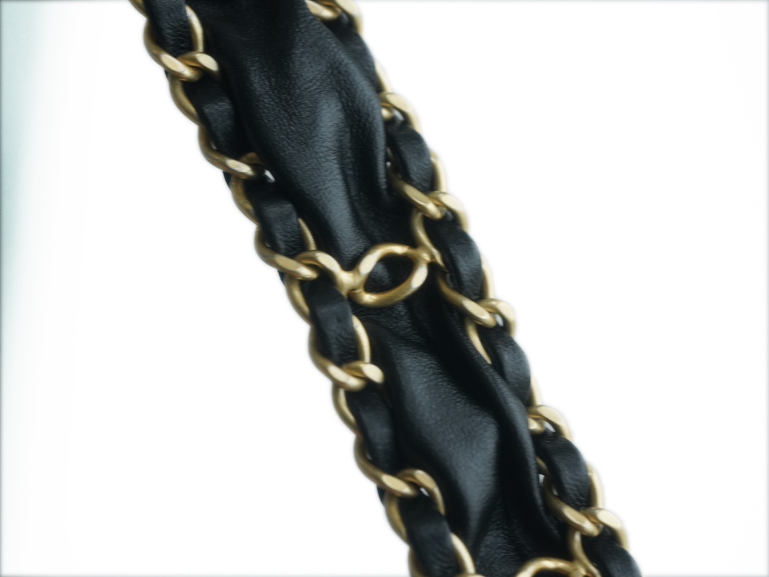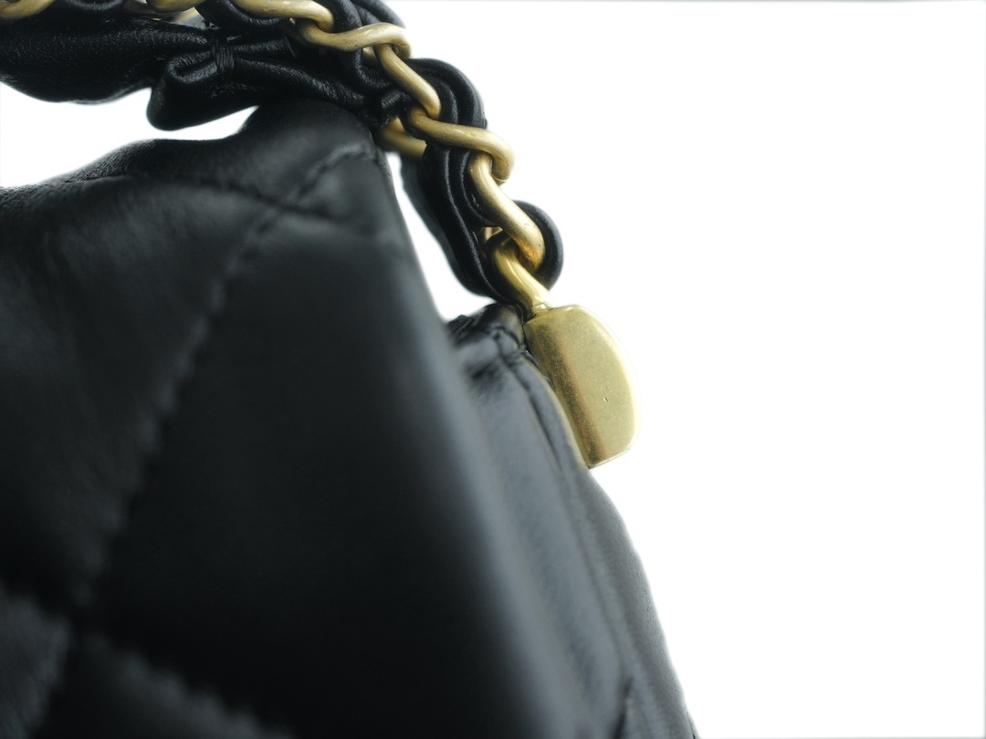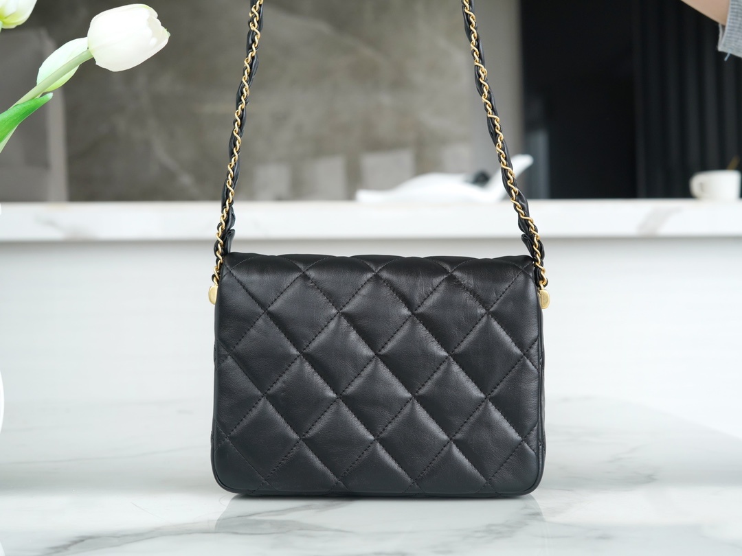 23k 추동 19 와이드 체인 플랩 숄더백 모델번호 AS4423 와이드 숄더 스트랩 블랙 골드 셔링 소가죽으로 클래식한 체크 패턴 디자인과 메탈 체인의 매치가 19의 클래식한 요소를 이어주어 세련되게 연출하실 수 있음 늠름하고 심플하며 상체에 스타일리쉬한 연출이 가능 사이즈: 20.5x15x5cm