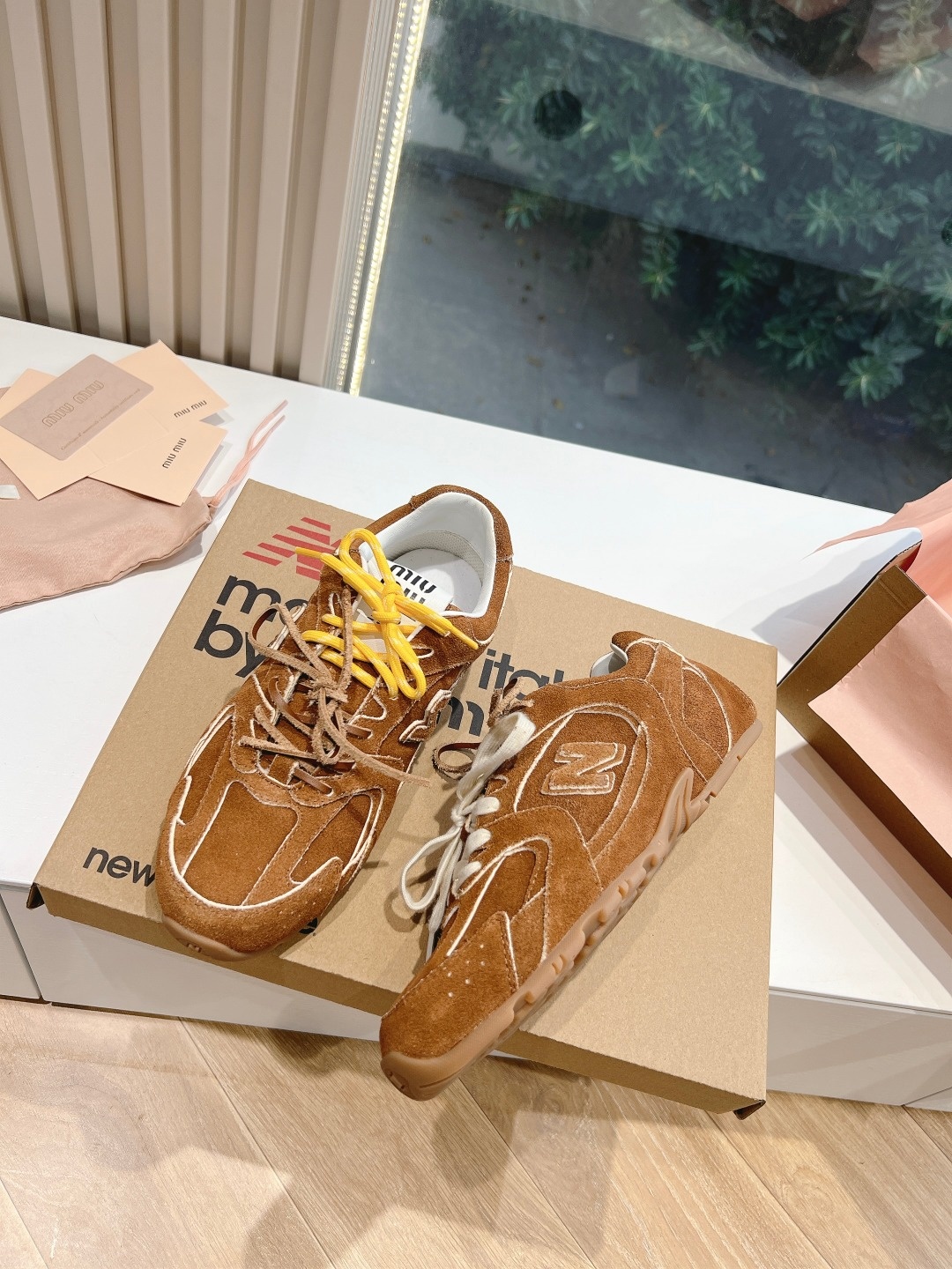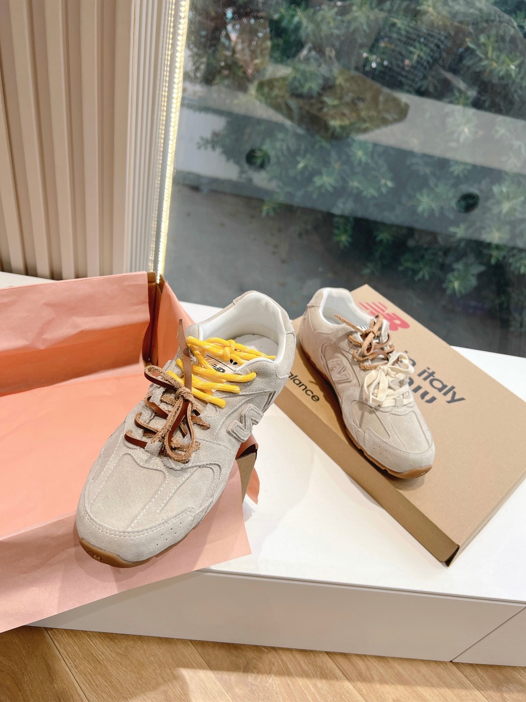 MiuMiu x New Balance 2024 이른 봄 발매 신상 스니커즈 10월 파리 패션위크에서 눈치 빠른 팬들의 눈에 띄었음 MiuMiu x New Balance의 후속작 클래식한 뉴발란스 530이 주인공 미우미우는 530에 익숙한 화이트 웨이브 슈즈 배색에서 벗어나 다크브라운, 그레이, 오래된 원단을 본뜬 뉴발란스 530의 실루엣을 감싸고 있으며 의도적으로 마모되고 고르지 않은 가죽 톤으로 웨이브 슈즈의 개성을 더함 겉감: 오리지널 맞춤 스크럽 소가죽 안감: 원판 내리 밑창: 원형절개