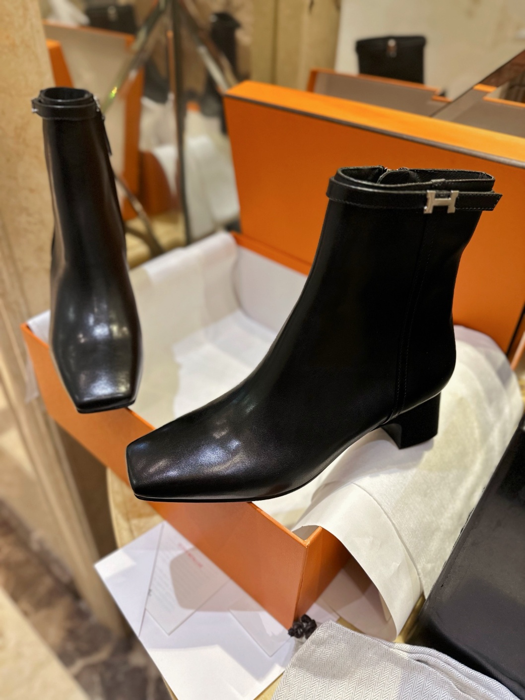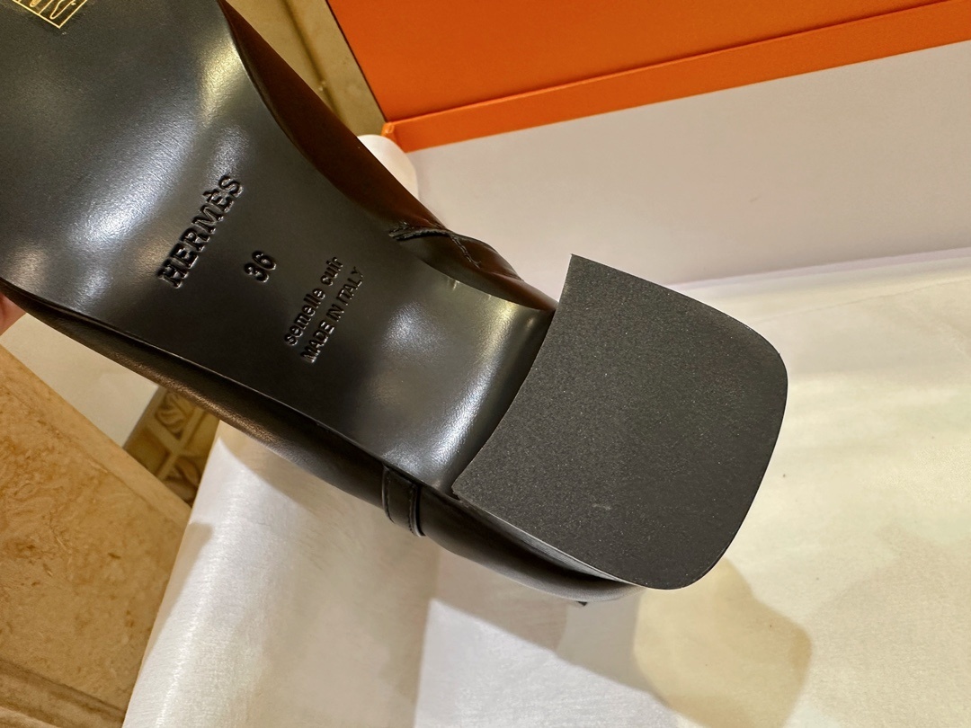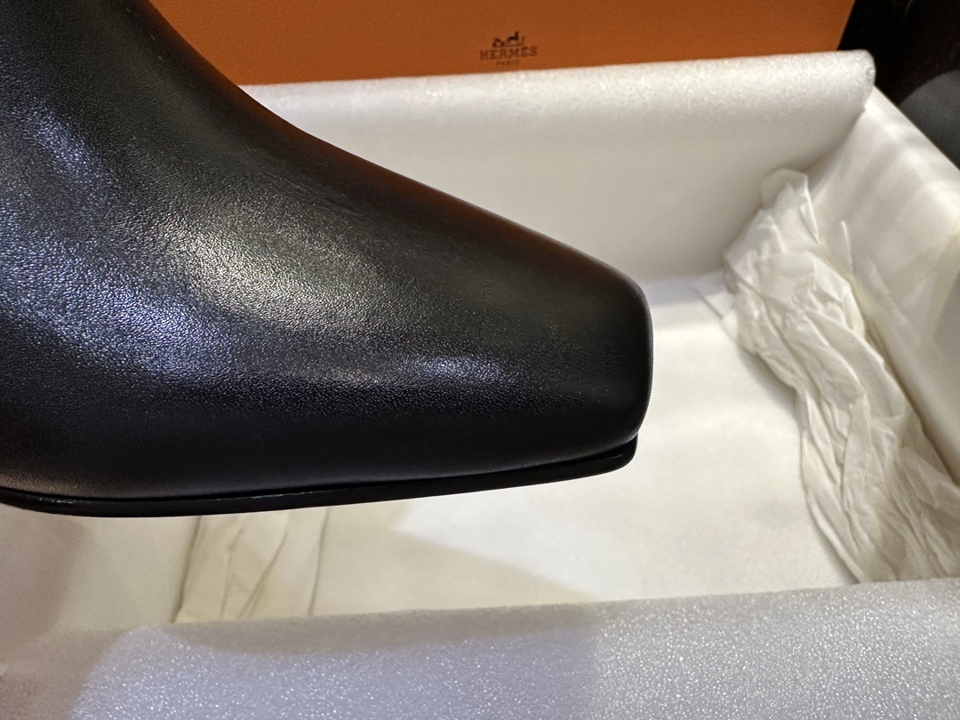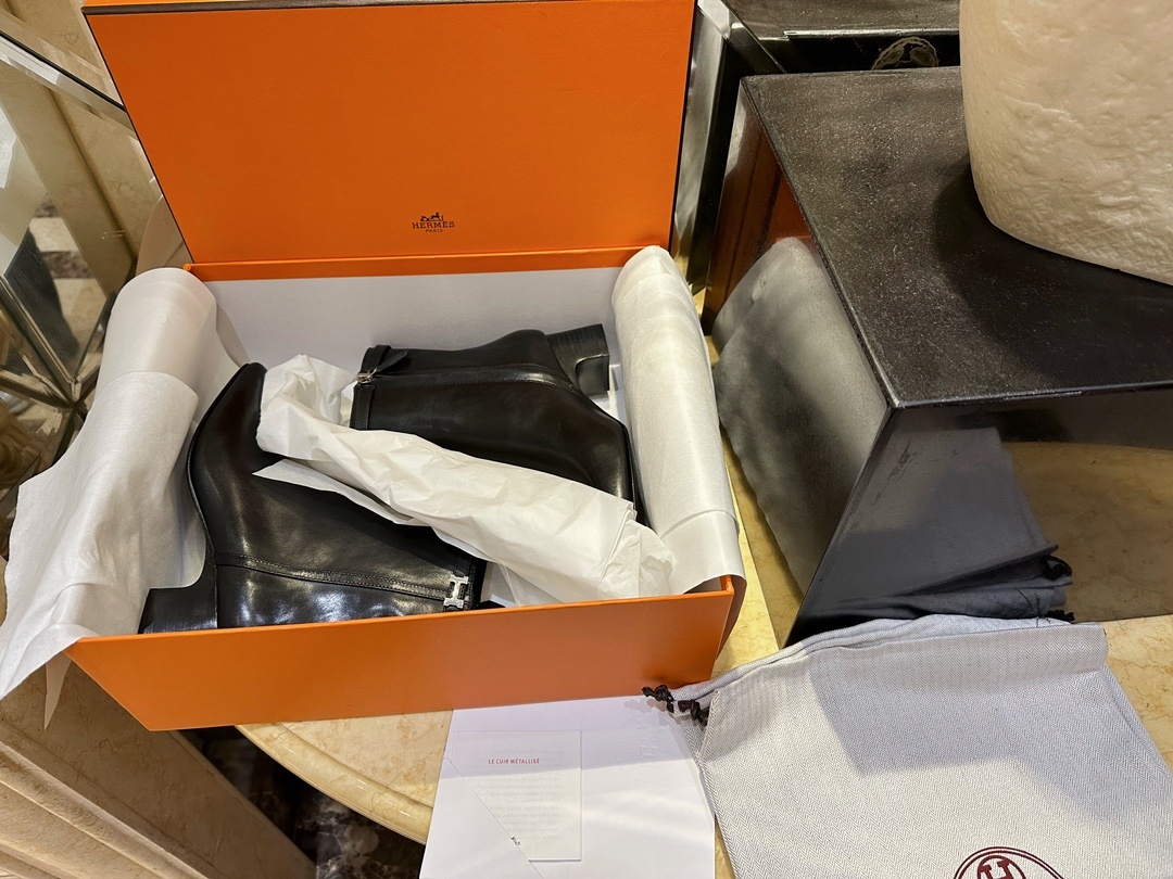 Hermes Hommage 부츠 전체 슈즈는 소가죽으로 천연가죽의 텍스쳐 특성을 살려 광택이 있고 질감이 있으며, 발바닥의 대표적인 로고가 정교하며 이태리 가죽의 통굽이 매우 질감이 있고 5cm 스퀘어굽이 딱 맞는 리프팅 효과로 발도 안정적이고 zp의 세련됨도 우리가 빼놓을 수 없는 분위기