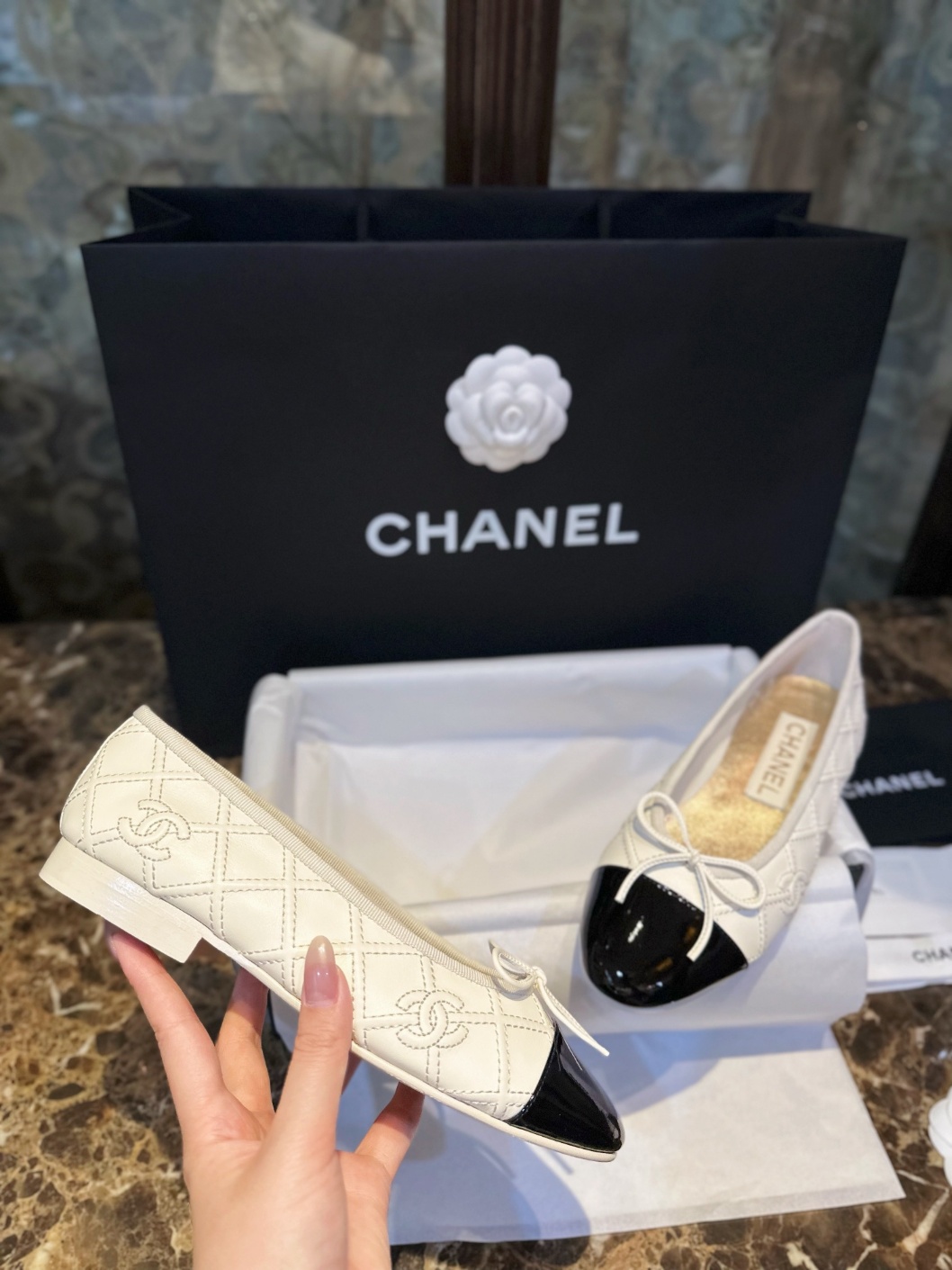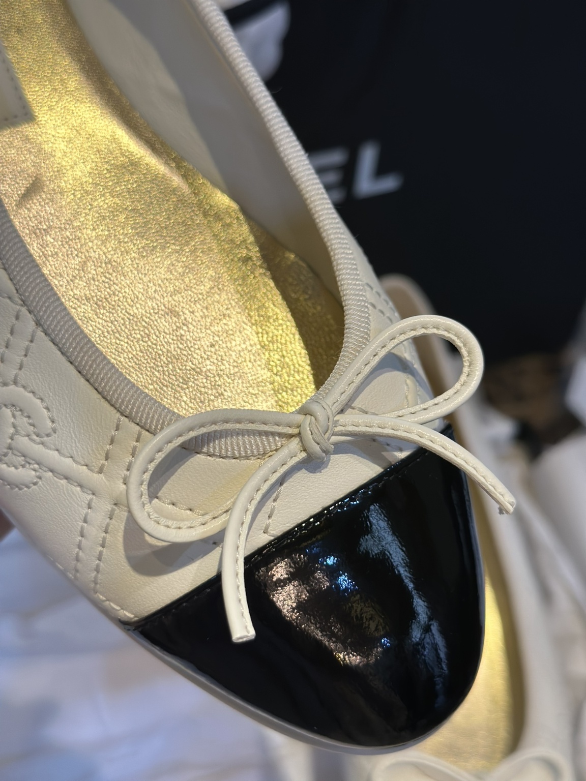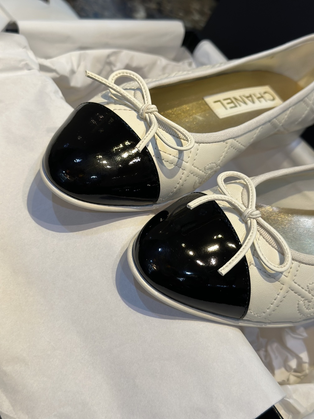 샤넬 입체자수 화이트 발레슈즈 수입 친환경 양가죽 입체 마름모 로고 1개월 남짓의 과정은 정말 설명하기 어려움, 험난함 미백통 마름모에 검정 초광택 에나멜 가죽을 매치하여 특별한 고급스러움과 멋스러움이 돋보임 공주님의 발레화, 절대 놓치지 마세요