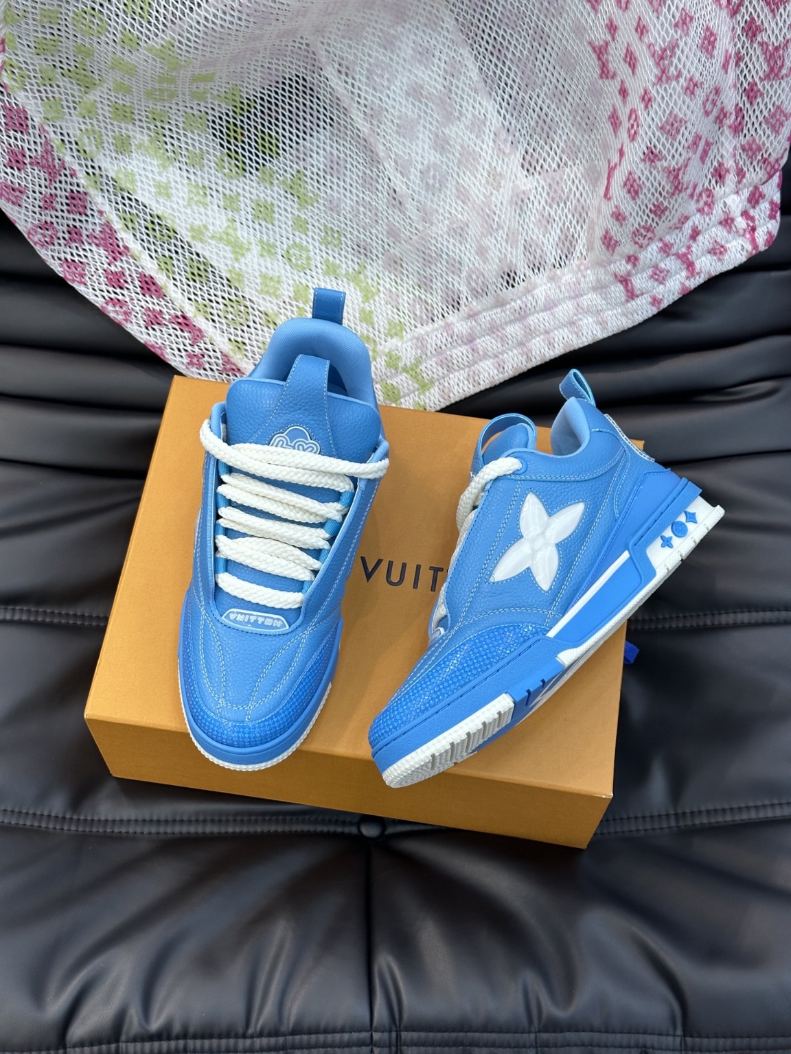 LV 스케이트 운동화 Skate 운동화 패치 Monogram 데님 패브릭과 테크니컬 메시 소재 테크니컬 신발 끈과 고무 아웃솔을 매치하여 1990년대의 스포티한 매력을 선사함 깔창을 덧댄 칼라와 혀는 아이코닉한 요소를 이어가며, 후자의 LV Since 54 로고는 루이비통이 1854년 창립한 것을 대표합니다.모노그램 플라워 포인트 고무 아웃솔, 헤드 소가죽 스티치 하이테크 패브릭 원단, 앞코 착색 고무 랩, 망사 안감 깔창, 편안함의 극치, 최고 품질, 최고 품질