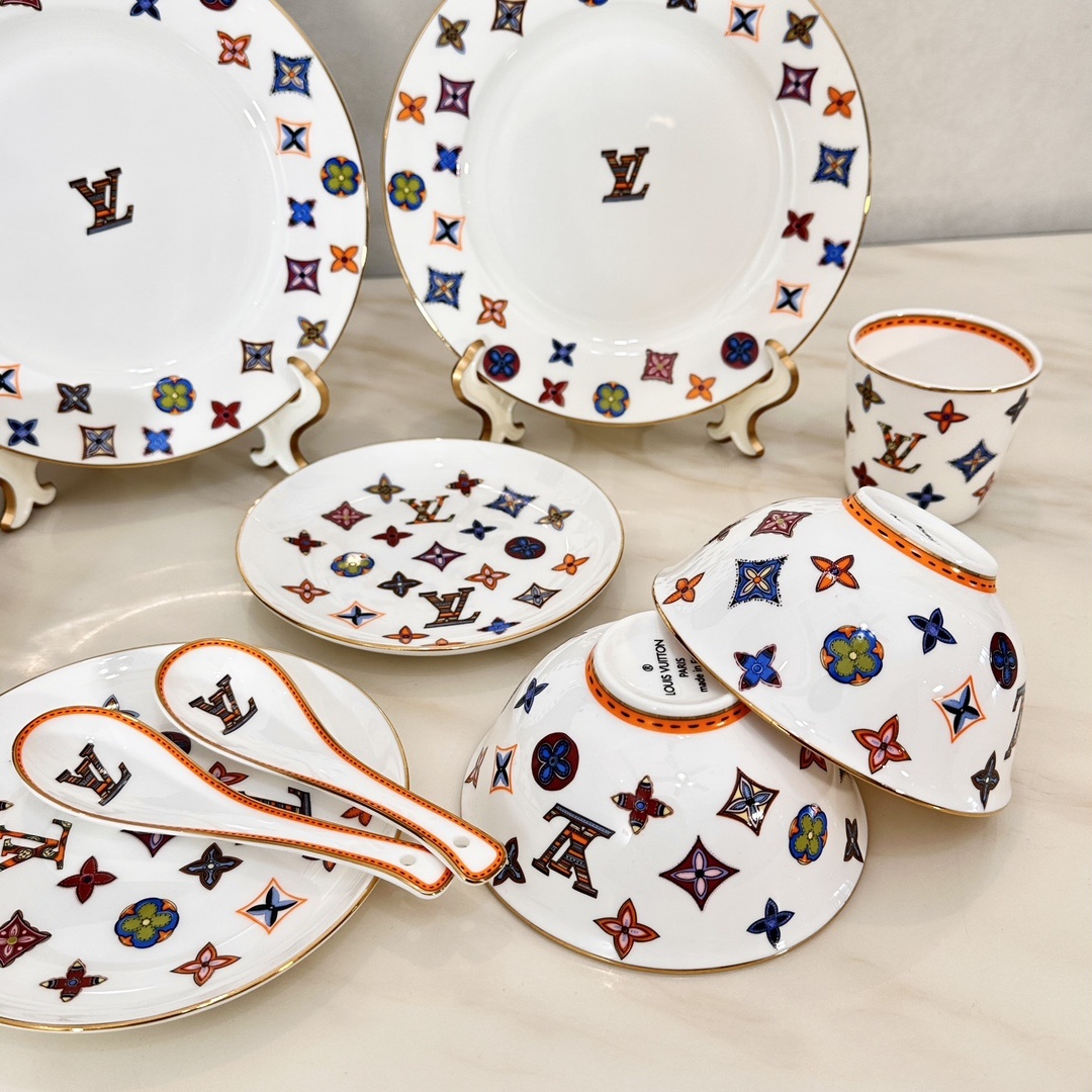 LV골자10pcs 세트 45% 고골자기 함량, 1350도 고온 소성 8인치 접시2, 골반2 종지2, 수저2, 컵2 나무 케이스 코디